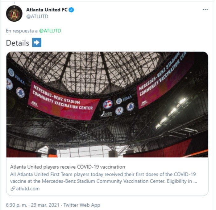 Un par de futbolistas mexicanos ya han sido vacunados contra el COVID-19. Mediante su cuenta oficial de Twitter, el Atlanta United -club que milita en la Major League Soccer (MLS)- informó que toda su plantilla recibió la primera dosis de inmunización, incluidos el delantero Érick Torres y el volante Jürgen Damm.Las regulaciones del estado de Georgia permiten que todos los mayores de 16 años de edad sean vacunados, por lo que no se hizo en detrimento de algún grupo social. "Todos los jugadores del primer equipo de Atlanta United recibieron hoy sus primeras dosis de la vacuna COVID-19 en el Centro Comunitario de Vacunación del Estadio Mercedes-Benz", informó el club, mediante un comunicado."La elegibilidad en Georgia está abierta actualmente para todos los mayores de 16 años y los jugadores siguieron las pautas estatales para hacer citas". El Atlanta United es el primer conjunto de la MLS que vacuna a su plantilla.OF