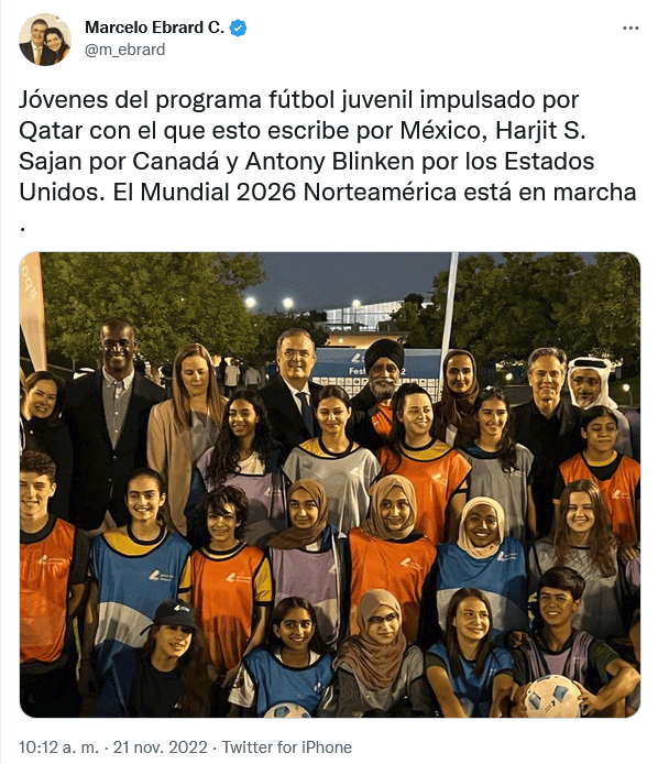 El canciller Marcelo Ebrard se reunió con el secretario de Estado estadounidense, Antony Blinken, en la inauguración del Mundial de Qatar 2022 y aseguró que México, Estados Unidos y Canadá se alistan como sede para la Copa Mundial de 2026."Con Antony Blinken tuve el agrado de participar en encuentro con futbolistas jóvenes de México, Estados Unidos y Canadá. Iniciamos el camino al mundial de 2026 que organizaremos los tres países", escribió Marcelo Ebrard en redes sociales.En su visita, el secretario de Relaciones Exteriores anunció que México comenzará a exportar aguacate a Qatar, como parte de un proyecto impulsado por la dependencia y el Consejo de Negocios México - Qatar.El primer envío de aguacate hass es proveniente de Tacámbaro, Michoacán, por parte de la PYME David's Avocados, y de la mano y asesoría del corporativo La Viña.Además, se espera que las importaciones semanales de 15 toneladas a partir de la última semana de noviembre."Lo que ustedes están viendo aquí, o sea lo que nosotros llamamos guacamole es la presencia de México en todo el mundo, porque cómo vamos a ir a un Mundial sin guacamole", expresó el canciller.OF