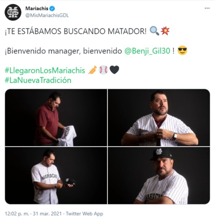 Después de que fuera el enemigo número uno de la afición beisbolera de Jalisco, Benjamín Gil tendrá la oportunidad de convertirse en ídolo tapatío, pues este miércoles los Mariachis de Guadalajara lo anunciaron de manera oficial como su manager.Fue a través de sus redes sociales que el nuevo equipo de Guadalajara informó de manera formal la contratación del manager campeón de la Liga Mexicana del Pacífico (LMP).''Te estábamos buscando, 'Matador', bienvenido manager, bienvenido Benjamín Gil'', escribió la cuenta oficial de los Mariachis.Esta es una contratación de peso en la novena de Guadalajara, pues de 2015 a la fecha, Benjamín Gil ha ganado cuatro veces la LMP con los Tomateros de Culiacán, y ahora tratará de repetir esos éxitos en la Liga Mexicana de Beisbol (LMB).Gil es uno de los mexicanos campeones de Serie Mundial (2002 con los Angels), y actualmente es uno de los managers más ganadores de la pelota invernal mexicana.Esta noticia llega sólo un día después de que Mariachis anunciará la contratación del ex ligamayorista Adrián ''Titán'' González.OF