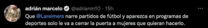 En las últimas horas Marion Reimers se ha convertido en tendencia en las redes sociales luego de que tuvo una discusión en pleno programa en vivo con su compañero Omar Zerón. Tras esta gran polémica millones de usuarios arremetieron contra la narradora y conductora deportiva, entre ellos el también conductor Adrián Marcelo quien le dejó un pequeño mensaje. El youtuber y conductor de canal 6 decidió responderle a Reimers a través de su cuenta de Twitter, mencionando que con sus narraciones y su presencia en programas lo único que lograba era cerrarle las puertas a otras mujeres que buscan llegar a los medios deportivos. "Que Marion Reimers narre partidos de futbol y aparezca en programas de deportes solo le va a cerrar la puerta a mujeres que quieran hacerlo", escribió el conductor.Luego de criticarla, la conductora no tardó en responderle y lamentó que un hombre se anime a confesar su desdén por las mujeres así. "Qué peligroso que existan hombres que se animen a confesar su desdén por las mujeres así, públicamente y a sabiendas que NO PASA NASA. Aunque así al menos sabemos el tipo de hombre con el que nos encontramos en las calles cuando te veamos", dijo la conductora.Horas después el tuit de Adrián Marcelo fue eliminado y hasta el momento no ha dado ninguna aclaración al respecto. Los comentarios negativos para la experimentada narradora se hacen presentes en cada juego que trasmite, mismo en los que la afición pide cambiar su estilo ante los micrófonos.Con información del Universal MF