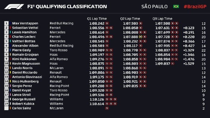 El holandés Max Verstappen, de la escudería Red Bull, saldrá este domingo desde la primera posición de la parrilla en el Gran Premio de Brasil, penúltima prueba del Mundial de Fórmula Uno, que se disputará en el circuito de Interlagos de Sao Paulo.Verstappen, que había marcado el mejor tiempo en las dos rondas anteriores, fue el más rápido en la Q3 al completar su mejor vuelta con un tiempo de 1:07.508.El alemán Sebastian Vettel (Ferrari), que se quedó a 123 milésimas de la pole, acompañará al piloto de Red Bull desde la primera línea de la parrilla.Por detrás se quedaron el británico Lewis Hamilton, que se proclamó campeón por sexta vez en la anterior prueba, en Austin, y el monegasco Charles Leclerc (Ferrari).OF