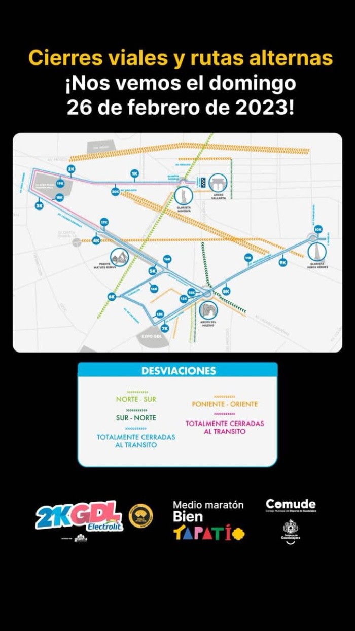 ¡Comienza la cuenta regresiva! El Medio Maratón de Guadalajara ya se encuentra a la vuelta de la esquina y con ello una serie cierres viales que pueden afectarte para llegar a temprana hora a tu destino. Será emañana 26 de febrero, en punto de la 6:30 horas, que se dará el disparo de salida del 21k de Guadalajara, donde 15 mil corredores irán en busca de la gloria deportiva, este evento se suma a las festividades del 481 aniversario de la Perla Tapatía.Es por eso, que si usted es de los que tienen que madrugar para ir a trabajar, tiene algún compromiso o circula por el rumbo, aquí le decimos cuáles serán los cierres y rutas alternas, para que no lo sorprenda el tráfico y así evitar demoras y el tráfico vial.Tal como lo marca la regla, para un medio maratón es necesario trazar un recorrido de 21 kilómetros, en esta ocasión la salida se dará a unos metros de la Glorieta de la Minerva, habrá 3 salidas: a las 6:20 de la mañana comenzarán a desfilar los paratletas, a las 6:30 se dará el disparo para los atletas elites y clasificados, y 10 minutos más tarde tendrán salida los atletas convencionales.Los runners tomarán avenida Vallarta rumbo a Niño Obrero y de ahí darán vuelta a mano izquierda, para después tomar Lázaro Cárdenas a toda velocidad y pasar por el emblemático puente Matute Remus, tomarán Chapalita, Avenida de las Rosas y Mariano Otero durante tres kilómetros, rodeando la Glorieta Niños Héroes hasta llegar a la calle Bruselas, de ahí regresarán de nuevo por Mariano Otero hasta llegar a Avenida de las Rosas, luego Chapalita y de ahí tomar de nuevo Lázaro Cárdenas hasta llegar a los Arcos del Milenio y retornar de nuevo por Lázaro Cárdenas y de ahí volver rumbo a Niños Héroes, Niño Obrero y por último llegar por Avenida Vallarta, donde se encontrará la Meta.Las desviaciones y vías alternas para los automovilistas son: de Norte a Sur por el paso a desnivel de López Mateos, desde Eulogio Para y saliendo hasta Plaza del Sol. De Poniente a Poniente a Oriente por Avenida México. Otro opción es que pueda circular por Avenida Niños Héroes.Cabe recordar que en esta edición pasó de 12 a 15 mil participantes debido a la gran demanda de corredores, además de que otorgará plazas para asistir a los Juegos Centroamericanos y del Caribe de San Salvador que se realizarán este año. Será en los próximos días que se den a conocer el nombre de los atletas elite que participarán. io