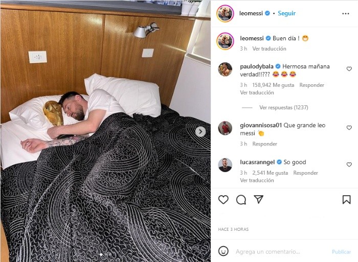 La foto de Lionel Messi que todos estaban esperando ya se viralizó en redes sociales.Lionel Messi conquistó el Mundial de Qatar 2022, el primero en su laureada carrera y el trofeo que ganó la Selección de Argentina se ha convertido en su mejor acompañante en los últimos días.En la premiación, en la cancha, en la llegada a su país natal y ahora amaneciendo con ella. El trofeo del campeón del Mundo acompaña a Messi a todas partes."La Pulga" subió a sus redes sociales algunas fotografías de él, despertando junto al codiciado trofeo y la leyenda: "Buenos días".La Selección Argentina arribó a su país, en la madrugada de este miércoles y fueron recibidos desde el aeropuerto por miles de fanáticos.Leo Messi, en su quinta Copa del Mundo, batió varios récords antes de terminar con una sequía de 36 años sin ganar un Mundial.De entrada en la final, Messi se convirtió en el jugador con más presencia en partidos de la Copa del Mundo al alcanzar los 26 para romper el empate que mantenía con el alemán Lothar Matthäus.Al llegar a los 23 minutos de la final, Messi también quebró el récord de minutos jugados en mundiales, los dos mil 216 de Paolo Maldini. El capitán argentino dejó un acumulado de dos mil 314.Messi también cerró su paso por Qatar 2022 como el único jugador argentino en marcar goles en cuatro mundiales distintos.Ha anotado 13 goles en total, empatado con el francés Just Fontaine en el cuarto puesto de la tabla histórica. Y quedó como el máximo goleador de la Albiceleste en los mundiales, dejando atrás los 10 de Gabriel Batistuta.OF