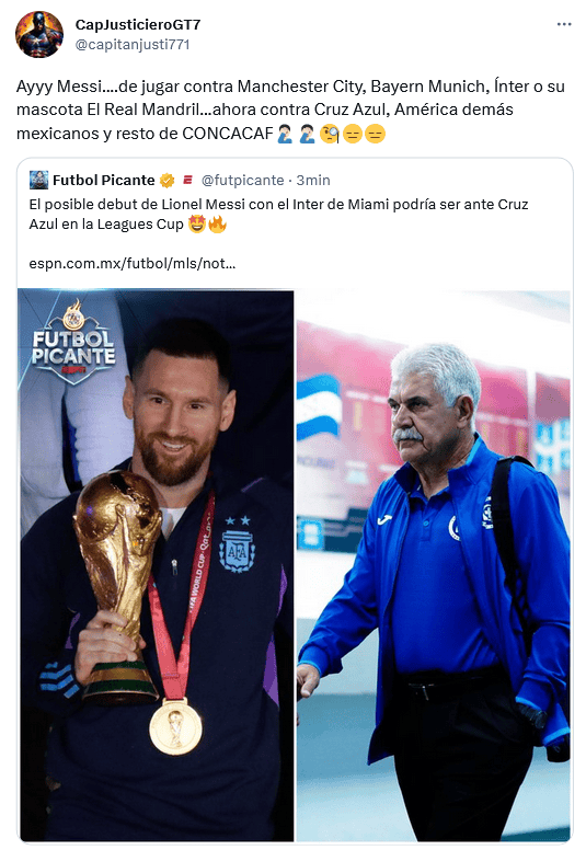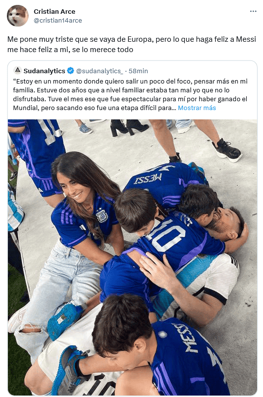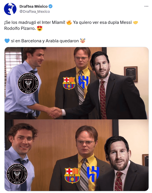 Este miércoles, Lionel Messi y el Inter Miami confirmaron que el argentino emigrará al futbol de Estados Unidos después de descartar las opciones de volver al Barcelona de España o firmar por el Al-Hilal de Arabia Saudita.Ante el bombazo mundial que supone la noticia, los usuarios de redes sociales no se han hecho esperar y con mensajes y memes han reaccionado a la decisión que tomó el "10" que ganó la Copa Mundial de Qatar 2022."Tomé la decisión de que voy a ir a Miami (...) Me faltan algunas cosas pero decidimos continuar el camino. Si no salía lo del Barcelona, quería irme de Europa, salir del foco y pensar más en mi familia", dijo Messi en entrevista con los medios españoles Mundo Deportivo y Sport.OF