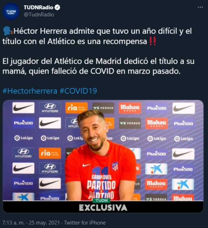 En una charla que mantuvo con TUDN, el mediocampista mexicano Héctor Herrera habló del haber hecho historia con el Atlético de Madrid, que se consagró campeón de LaLiga de España el pasado fin de semana, y además, tuvo unas palabras para dedicarle el título a una persona especial: su madre, que falleció por COVID-19.Héctor Herrera señala que donde quiera que esté, su madre debe estar muy orgullosa por el objetivo que consiguió esta temporada.''Yo se lo dedico a mi madre, que fue la que siempre estuvo a mi lado, y que estoy seguro que donde está, estará más feliz que yo y más orgullosa que cualquier persona'', dijo el ex jugador del Pachuca.''Y bueno, después (le dedico el título) a mi familia, que está siempre conmigo, creo que ellos lo merecen más que nadie. Yo creo que libera todo lo que fue el año, un año difícil''.El pasado fin de semana, Héctor Herrera se unió a la selecta lista de futbolistas mexicanos que han sido campeones en Europa, y específicamente en España, sólo detrás de Hugo Sánchez con el Real Madrid, Rafael Márquez y Jonathan dos Santos con el Barcelona.OF