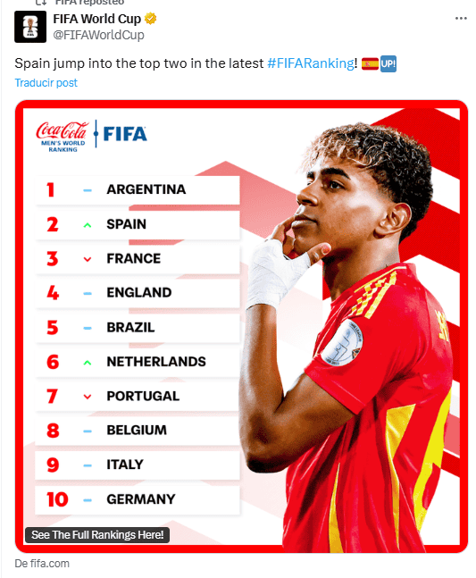 Este jueves 3 de abril, la FIFA dio a conocer el primer ranking de selecciones masculinas de 2025, con Argentina como líder indiscutible, seguida por España, Francia, Inglaterra y Brasil, que completan el Top 5.En la lista también se reveló que México ascendió al lugar 17, tras haber ocupado la posición 19 en el ranking anterior, el último de 2024.Las victorias de Argentina en las eliminatorias de la Conmebol rumbo al Mundial de 2026 beneficiaron a la Albiceleste, que encabeza la clasificación con mil 886.16 puntos. España y Francia intercambiaron posiciones debido a sus resultados en la UEFA Nations League, mientras que algo similar ocurrió con Países Bajos y Portugal, que se ubicaron en los puestos 6 y 7, respectivamente.Del octavo al décimo lugar se encuentran Bélgica, Italia y Alemania. Más abajo aparecen Croacia y Marruecos, que subieron dos posiciones cada uno; Uruguay y Colombia, que descendieron dos sitios; y en el escalón 15 está Japón, por delante de Estados Unidos como la mejor posicionada de la Concacaf, seguida por México.La Selección Mexicana ganó la Concacaf Nations League, resultado que le permitió mejorar en la clasificación al pasar del puesto 19 al 17.En el lugar 18 figura Irán; en el 19, Senegal, que descendió dos posiciones; y en el 20, Suiza.La mayor caída fue para Guinea-Bisáu, que perdió ocho sitios; mientras que Myanmar protagonizó el ascenso más destacado, al subir siete. La Selección de Bosnia-Herzegovina fue la que más puntos sumó, con 24.16; en contraste, Irak perdió 29.46.La próxima actualización, según el portal de la FIFA, será el 9 de julio.*Mantente al día con las noticias, únete a nuestro canal de WhatsAppOF