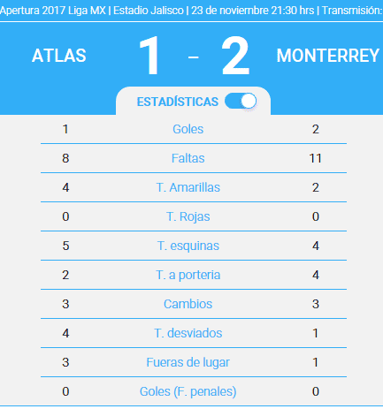 El Monterrey se impuso 2-1 al Atlas juego de ida de cuartos de final del Apertura 2017 disputado en el Estadio Jalisco.