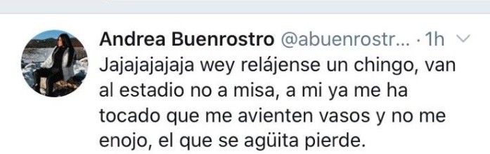 Tras la derrota de Chivas ante Dorados, en la tribuna apareció "#LadyCerveza", una aficionada que en algo que parecía gracioso, terminó por quedarse cerca de un acto de violencia en el Estadio Akron.Las acciones fueron capturadas por una aficionada de nombre Andrea Buenrostro, quien grabó y subió las imágenes en sus "Insta Stories", las cuales eliminó posteriormente.Aranza Sánchez, una fanática al Rebaño, arrojó un vaso de cerveza, el cual terminó por mojar a otros seguidores rojiblancos que se encontraban ubicados delante de ella y que posteriormente, pudo terminar con un conflicto en las tribunas. Cabe destacar que tras cometer dicha infracción, buscó esconderse detrás de otros aficionados.Después de lanzar la cerveza, los aficionados afectados comenzaron a buscar culpables y los encontraron en personas que no tuvieron nada que ver con la desafortunada acción, a lo cual, las seguidoras se mostraron contentas e incluso no dudaron en mostrar lo "gracioso" que fue este hecho, subiendo todo a sus redes sociales.Andrea Buenrostro, a través de su cuenta de Twitter, justificó su acción mencionando que "no van a misa", además de finalizar su publicación mencionado que "el que se agüita pierde", mensaje que también fue eliminado posteriormente. Chivas ya se expresó ante esta situación en redes sociales, después de que aficionados solicitaran el veto para la mujer. "Ya estamos revisando el caso con las autoridades del @EstadioAkron para tomar las medidas correspondientes", fue el mensaje colocado por la cuenta oficial del club. AJ