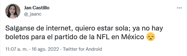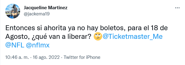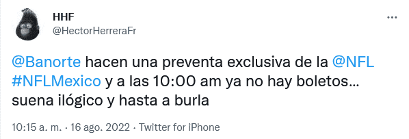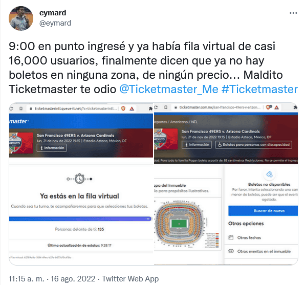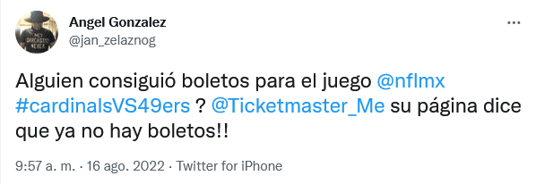 ¡Se acabaron! Este martes inició la venta de boletos para el partido de la NFL en México del próximo 21 de noviembre en el Estadio Azteca, entre los 49ers de San Francisco y los Arizona Cardinals. La preventa era para clientes Banorte, sin embargo, ya se encuentran agotados.Los boletos podían comprarse a través de la plataforma de Ticketmaster para aquellas personas que tienen tarjeta de Banorte, pero solamente duró una hora la venta y miles de aficionados al futbol americano mostraron su molestia por no poder alcanzar.Muchos se quejaron en redes sociales, por su frustración de no poder comprar las entradas. A pesar de haberse registrado para esta venta desde el mes de mayo, algunos se quedaron con las ganas o incluso no compraron debido a que los que estaban disponibles se encontraban fuera de sus posibilidades.De hecho, aunque este martes era la fecha oficial de la preventa, hubo antes una pre-preventa, pues algunos usuarios presumieron su compra desde el día lunes 15 de agosto, y hasta compartieron un link y clave especial para que así pudieran comprar boletos.Cabe destacar que la venta al público general será este próximo jueves 18 de agosto, aunque los boletos ya no estarán disponibles porque en estos días ya se agotaron.Aunque en el sistema de Ticketmaster ya no hay boletos, en sitios de reventa ya hay disponibles. El más barato va desde los cinco mil 996 pesos en la zona más alta del Estadio Azteca, mientras que el más caro está en 113 mil 926 pesos es en la zona baja lateral.OF