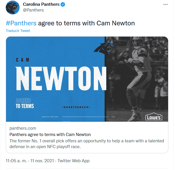 El equipo Carolina Panthers, de la Liga de Futbol Americano (NFL), anunció este jueves el regreso de su exestrella Cam Newton, que estaba sin equipo desde agosto, para sustituir al lesionado Sam Darnold.Newton, MVP (Jugador Más Valioso) de la liga en 2015, no ha disputado ningún partido de la actual temporada después de que fuera despedido por los New England Patriots a finales de agosto."Los Panthers acordaron el jueves los términos con el mariscal de campo Cam Newton", se limitó a decir la franquicia sobre el contrato, que está pendiente de la revisión física del quarterback.Newton, de 32 años, fue elegido por los Panthers con el número uno del Draft de 2011 y en 2015 lideró al equipo hasta el Super Bowl, en el que cayeron ante los Denver Broncos.Sin embargo, su carrera sufrió un bajón en las últimas temporadas, lastrado por numerosas lesiones, y los Panthers lo acabaron liberando en 2020.El quarterback intentó reconstruir su carrera firmando un contrato por una temporada con los Patriots como sustituto del legendario Tom Brady.Tras una decepcionante campaña, en la que quedaron fuera de playoffs, el técnico Bill Belichick dejó marchar a Newton en agosto para hacer sitio al novato Mac Jones, su quarterback del futuro.De vuelta a Carolina, Newton tendrá la misión de relevar a Sam Darnold, quien estará de baja entre cuatro y seis semanas por una lesión de hombro sufrida el domingo.Los Panthers ocupan la última posición de la división Sur de la Conferencia Nacional con cuatro victorias y cinco derrotas.OF