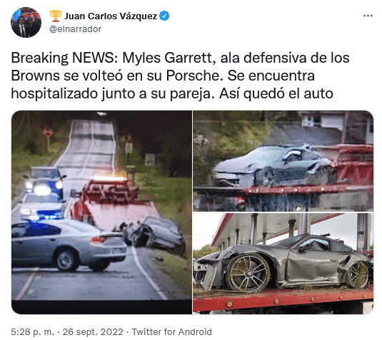 El defensive end de los Cleveland Browns, de la NFL, Myles Garrett, está hospitalizado con lesiones no dadas a conocer después de que ayer volcó su Porsche en un accidente que no involucró ningún otro vehículo tras el entrenamiento.Los Browns informaron que Garrett sufrió "lesiones que no ponen su vida en riesgo", en el accidente que ocurrió en un camino rural pocas horas después del entrenamiento. El equipo no proporcionó más detalles de las lesiones o de su condición.Su agente Nicole Lynn dijo en un comunicado en Twitter que Garrett ha estado "alerta y receptivo" mientras recibe atención médica. Agregó que "estamos esperando para conocer la gravedad de las lesiones".En nombre de la familia Garrett, Lynn le agradeció al personal médico por sacar al jugador de 26 años y su acompañante femenina del vehículo y llevarlos a un hospital.La policía de la autopista estatal de Ohio aseguró que respondió a un vuelco cerca de las tres de la tarde. Cuando llegaron los agentes, encontraron el Porsche 911 Turbo S gris en el lado derecho de la carretera con daños por el vuelco.El accidente continúa siendo investigado, pero la patrulla indicó que "no sospechan de una afectación por alcohol o drogas". Garrett y la pasajera utilizaban el cinturón de seguridad. Varios medios locales publicaron imágenes del daño al vehículo deportivo, que puede alcanzar 330 kilómetros por hora.Garrett y sus compañeros regresaron a entrenar después de un fin de semana largo tras vencer el jueves en casa a los Steelers de Pittsburgh.Garrett, de 26 años, estuvo en el vestuario tras el entrenamiento matutino.Se desconoce si el estatus de Garrett para el encuentro del domingo en Atlanta se verá alterado por el accidente.Garret necesita sólo una captura más para convertirse en el líder histórico del equipo.Apenas participó de un par de tacleadas en la victoria contra los Steelers el jueves. Uno de los jugadores más dominantes de la NFL, Garrett fue la primera selección de Cleveland en 2017. Estableció un récord de temporada del equipo con 16 capturas la campaña anterior y suma 61 1/2 capturas en 71 encuentros.OF
