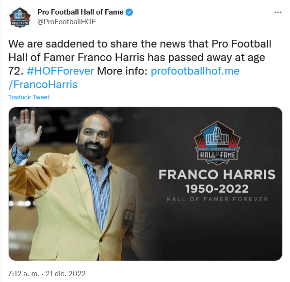 Franco Harris, el running back cuyo ingenio gestó "La Recepción Inmaculada", considerada como la jugada más icónica en la historia de la NFL, ha fallecido. Tenía 72 años.El hijo de Harris, Dok, informó a AP que su padre falleció durante la noche del martes. No se dio a conocer la causa del deceso.Su fallecimiento ocurre dos días antes del 50 aniversario de una jugada que fue clave para que los Steelers dieran al salto definitivo para convertirse en uno de los equipos de la élite de la NFL, y tres días antes que Pittsburgh había previsto una ceremonia para retirar su número 32 durante el descanso del partido contra los Raiders de Las Vegas."Hemos perdido a un jugador increíble, un embajador increíble del Salón de la Fama y, lo más importante, al mejor caballero", dijo el presidente del Salón de la Fama del futbol americano, Jim Porter. "Franco no sólo tuvo impacto en el deporte, sino que influyó en las vidas de tanta gente de una manera muy positiva".Harris acumuló 12 mil 120 yardas y ganó cuatro anillos del Super Bowl con los Steelers durante la década de los 70, una dinastía que comenzó de lleno cuando Harris no paró de correr tras un lanzamiento del quarterback de los Steelers Terry Bradshaw en el duelo de los playoffs contra Oakland en 1972.Con perdiendo Pittsburgh perdiendo 7-6, en 4 y 10 desde su propia yarda 40 y 22 segundos por jugar en el último cuarto, Bradshaw retrocedió y lanzó profundo hacia el running back Frenchy Fuqua. Fuqua y el defensive back de Oakland Jack Tatum chocaron, y el ovoide quedó flotando justo por encima de la superficie sintética del estadio Three Rivers. Harris lo atrapó en la 45 de Oakland y corrió hacia la zona de anotación, en medio de varios defensores de los Raiders, para darle a los Steelers la primera victoria en los playoffs en la historia de cuatro década de estos.OF