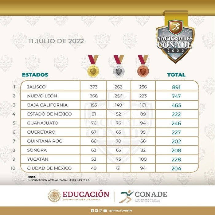 El éxito de Jalisco no pasa desapercibido en el deporte nacional, y es por eso que este día Ana Gabriela Guevara se unió a los festejos de esta entidad por haber obtenido el título en los Nacionales Conade.Para la titular de la Comisión Nacional de Cultura Física y Deporte (Conade), ha sido un gusto ver en competencia a los atletas de la delegación azul y oro.“Es un medallero rotundo, ya quedan pocos días y pocas medallas por disputar en las sedes y deportes restantes, un poco más de 50 medallas, así que sería difícil remontar a Jalisco en el medallero, así que enhorabuena, felicidades por este trabajo, porque ha sido un gusto ver competir a todos los atletas de Jalisco con esa entrega dentro del área”, comentó Guevara.Este lunes Jalisco se proclamó campeón de la justa nacional, pues el equipo auriazul inició esta semana con 373 medallas de oro, esto cuando Nuevo León, su más cercano perseguidor, apenas registró 268 al arrancar la jornada de este día.Esta edición de los Nacionales Conade inició el 31 de mayo y terminará el 26 de julio.JL