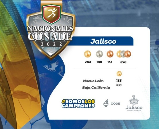 En una fiesta total, la selección Jalisco de atletismo hizo su debut en los Nacionales CONADE 2022 y fue tal y como se esperaba, ganando medallas. Así, la entidad azul y oro se llevó siete preseas, de las cuales tres fueron de oro, dos de plata y dos de bronce, en la competencia llevada a cabo en Hermosillo, Sonora, sede de esta disciplina.Todo indició con Jonathan Reyes (Sub16) quien se quedó con el primer puesto de los 2,000 mts. planos con un tiempo de 5 minutos 43 segundos; luego le siguió Emiliano Barba (Sub16), quien se proclamó campeón nacional de los 5,000 mts. marcha al cronometrar 22:38.42; y posteriormente en el relevo combinado femenil Sub16, América Guerrero, Luna Govea, Camila Rodríguez y Eva Pérez, le dieron a Jalisco el tercer oro de la noche.Las preseas plateadas las consiguieron Maximiliano Delgadillo, en los 300mts. planos Sub16 con un tiempo de 36 segundos y 79 centésimas, y Mario Vázquez, también en la Sub16, pero en los 2,000mts. planos con una marca de 5 minutos 44 segundos.Finalmente, los bronces se los llevaron Camila Rodríguez, en los 80m planos Sub16 al detener el reloj en 10 segundos 23 centésimas, y Luna Govea, quien finalizó los 300 mts. planos Sub16 en 41 segundos y 46 centésimas.No hay quien siquiera le haga sombra a la delegación de Jalisco que participa en los Nacionales CONADE 2022, y es que el equipo Azul y Oro domina con fuerza y por mucho, el medallero general.Jalisco suma, hasta el último corte reportado, 243 metales dorados, 188 de plata y 167 de bronce, para un total de 598 preseas y va que vuela para el título nacional de los Juegos.En la lista le sigue Nuevo León como la entidad más cercana a Jalisco con 155 medallas de oro, mientras que Baja California se ubica tercero con 108 preseas doradas.Con esto, queda comprobado que no importa que haya desaparecido la Olimpiada Nacional y haya llegado la modalidad de Juegos Nacionales de la CONADE, Jalisco domina ampliamente en el deporte amateur y semiprofesional a nivel nacional.GC