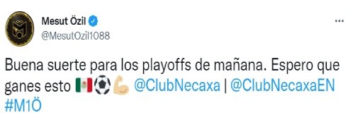 El conjunto del Necaxa se juega la vida este fin de semana ante Cruz Azul, donde ambos jugarán el repechaje para decidir quién pasará a la liguilla del Clausura 2022. Los Rayos tuvieron un buen cierre de torneo de la mano de Jaime Lozano, mismo que va generando confianza a los jugadores y a la misma afición. Un sentimiento que comparte el exjugador del Real Madrid Mesut Özil, quien aprovechó la oportunidad para dejarle un mensaje de apoyo en su cuenta de redes sociales al cuadro hidrocálido."Buena suerte para los playoffs mañana, espero que puedan ganar este partido", publicó el Campeón del Mundo en 2014 en su cuenta oficial de Twitter.El exinternacional alemán es uno de los accionistas del conjunto mexicano, donde también destacan nombres como Evan Longoria, Kate Upton y el lanzador de los Astros de Houston, Justin Verlanden.MF