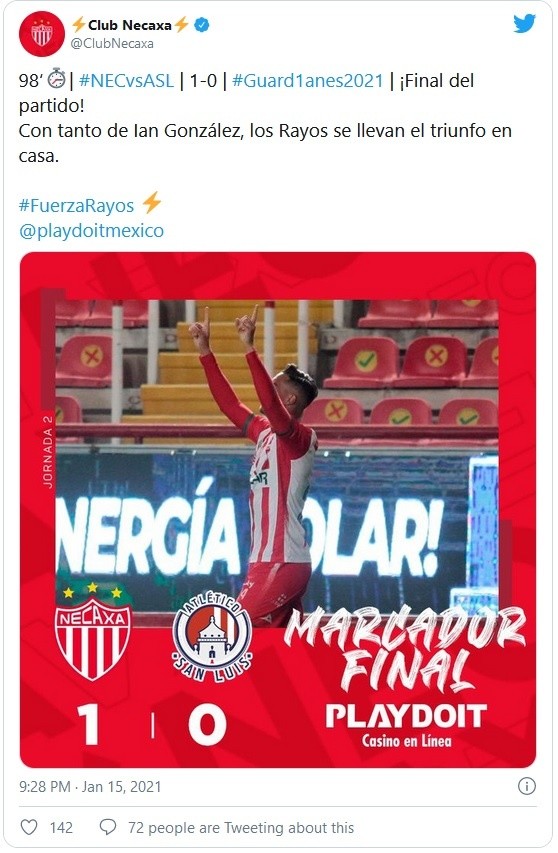 Con sus aficionados en las gradas y pese a jugar con 10 hombres durante casi todo el segundo tiempo, Necaxa se apoyó en un gol de penal del español Ian González sobre el final y derrotó 1-0 al Atlético de San Luis este viernes, en el primer partido por la segunda fecha del torneo Guard1anes 2021.González convirtió rasante y colocado a los 90 minutos para darles a los Rayos su primer triunfo del campeonato, en el segundo encuentro que se realiza con espectadores durante este torneo.Necaxa, que juega en el estado central de Aguascalientes, admitió al 30% de la capacidad del estadio Victoria, lo que equivale a unas siete mil personas, aunque el reporte oficial fue de menos de cuatro mil espectadores.Los Rayos ya habían recibido público durante la pandemia a mediados de octubre, cuando enfrentaron a Tijuana por la 14 fecha del torneo.Necaxa, que se quedó con 10 a los 47, tiene tres puntos y se coloca provisionalmente en la séptima posición.Pablo Barrera erró un penal en los descuentos para el Atlético de San Luis, que se queda sin puntos y se mantiene en la parte baja de la clasificación.JM