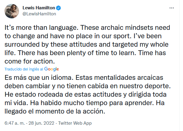 El siete veces campeón del mundo de Fórmula 1 (F1), Lewis Hamilton, reaccionó a las declaraciones racistas que el expiloto brasileño Nelson Piquet hizo sobre él. Para el británico, "esas actitudes arcaicas deben cambiar"."Son más que palabras. Esas actitudes arcaicas deben cambiar y no tienen lugar en nuestro deporte", publicó Hamilton en su cuenta de Twitter."He estado rodeado de comportamientos como ese y he sido un objetivo (de ellos) toda mi vida. Ha habido tiempo de aprender, ahora ha llegado el momento de pasar a la acción", añadió el piloto de la escudería Mercedes, actualmente sexto en el Mundial de F1 2022.En una entrevista en video concedida a la web Motorsports.com. en octubre de 2021, Piquet, de 69 años, rememoraba el incidente que enfrentó en julio de 2021 en la primera vuelta del GP de Gran Bretaña a Hamilton y al neerlandés Max Verstappen, que acabó con el abandono del piloto de Red Bull, cuya pareja es hija de Piquet, Kelly."El negrito (Lewis Hamilton) metió el auto y lo dejó porque no tenía cómo pasar a dos autos en esa curva. Jugó sucio. Su suerte fue que solo el otro (Verstappen) se jodió", declaró Nelson Piquet.Las declaraciones de Piquet fueron condenadas por la Federación Internacional del Automóvil (FIA) y por Fórmula 1, organizador del Campeonato del Mundo de F1."Las declaraciones discriminatorias o racistas son inaceptables bajo cualquier forma y no tienen lugar en la sociedad", reaccionó la F1 en un comunicado."Lewis es un embajador increíble para nuestro deporte y merece respeto", estima Formula 1 sobre el siete veces campeón de F1. "Sus esfuerzos incansables para mejorar la diversidad y la inclusión son una lección para muchos y un compromiso de parte de la F1"."La FIA condena enérgicamente cualquier lenguaje y comportamiento racista, que no tienen lugar en nuestro deporte o la sociedad", declaró por su parte la institución en Twitter. "Expresamos nuestra solidaridad con Lewis Hamilton y nuestro total apoyo a su compromiso con la igualdad, diversidad e inclusión en los deportes de motor", añadió la FIA.Mercedes, escudería del piloto británico, también reaccionó en Twitter: "Condenamos en los más enérgicos términos toda utilización de un lenguaje racista o discriminatorio del tipo que sea"."Lewis ha sido la punta de lanza de los esfuerzos de nuestro deporte para combatir el racismo, y es un verdadero campeón de la diversidad, dentro y fuera de las pistas", recuerda el texto.Hamilton se implicó de manera considerable con el movimiento "Black Lives Matter" en 2020. Gracias a su iniciativa, varios pilotos posaron con una rodilla en el suelo antes de varias carreras en señal de apoyo, y el color de los monoplazas de Mercedes pasó de gris al negro hasta el final de la temporada 2021."Juntos, compartimos la visión de un deporte automóvil diversificado e inclusivo, y este incidente señala la importancia fundamental de continuar a luchar por un futuro mejor", señala la escudería de Hamilton desde el año 2013.Nelson Piquet fue campeón del mundo de Fórmula 1 en tres ocasiones (1981, 1983 y 1987).OF