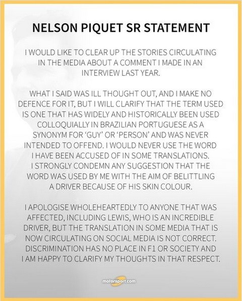 El ex piloto brasileño de Fórmula 1 (F1), Nelson Piquet, se disculpó "de todo corazón" con el británico Lewis Hamilton, luego de que se hiciera polémica el que lo calificara de "negrito" ("neguinho" en portugués brasileño) en una entrevista; también mostró su deseo de "aclarar" el dicho que fue considerado racista en redes sociales."Me disculpo de todo corazón ante todos los que han sido afectados, Hamilton incluido, que es un piloto increíble", dijo el brasileño de 69 años en un comunicado, "pero la traducción de algunos medios de comunicación que circula ahora en redes sociales no es correcta".En una entrevista de noviembre de 2021, pero que resurgió el martes en Internet, el tres veces campeón del mundo (1981, 1983 y 1987) utilizó la palabra "negrito" ("neguinho" en brasileño) para hablar de Hamilton, rememorando un accidente que implicaba al británico y al neerlandés Max Verstappen en la primera vuelta del Gran Premio de Gran Bretaña en 2021."El negrito (Lewis Hamilton) metió el auto y lo dejó porque no tenía cómo pasar a dos autos en esa curva. Jugó sucio. Su suerte fue que solo el otro (Verstappen) se jodió", declaró Piquet en la entrevista en video a la página web Motorsports.com.Hoy, Piquet quiso "aclarar las historias que circulan en los medios"."Lo que yo dije estaba mal y no me defenderé, pero quiero precisar que el término utilizado es un término que ha sido larga e históricamente utilizado en la lengua portuguesa brasileña como 'tipo' o 'persona' y que nunca ha estado destinado a ofender", asegura."No utilizaría nunca la palabra de la que me han acusado algunas traducciones. Condeno firmemente toda sugestión de que yo habría utilizado esa palabra con el objetivo de rebajar a un piloto debido a su color de piel", añade el antiguo piloto.El martes, Hamilton había reaccionado: "Son más que palabras. Esas actitudes arcaicas deben cambiar y no tienen lugar en nuestro deporte".Las declaraciones de Nelson Piquet fueron condenadas en el mundo de la F1, por la Federación internacional del automóvil (FIA), por Fórmula 1, organizador del Campeonato del mundo, y por escuderías y otros pilotos.Piquet, padre de la pareja sentimental de Verstappen, forma parte de los apoyos del jefe de Estado brasileño de extrema derecha Jair Bolsonaro.OF