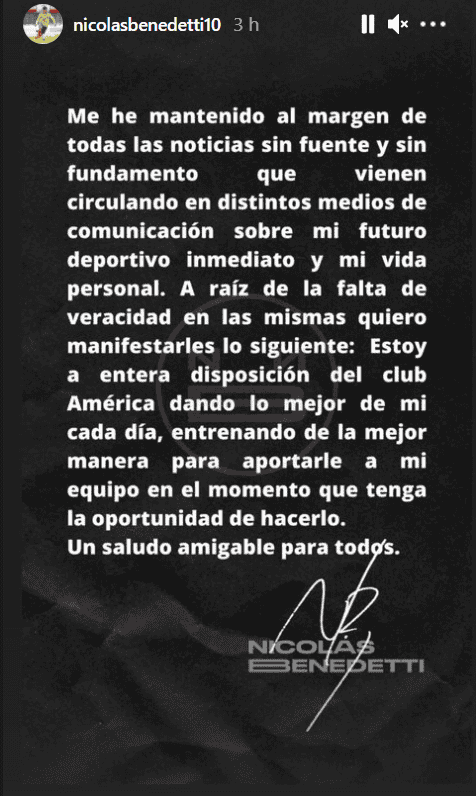 La situación de Nicolás Benedetti con el América sigue llena de incertidumbre. Si bien los acercamientos entre las Águilas y el Mazatlán FC son reales, el atacante colombiano desea permanecer con el conjunto azulcrema.Este martes por la tarde, Benedetti lanzó en sus redes sociales un mensaje en el que reafirma sus ganas por seguir con el conjunto de Coapa."Estoy a entera disposición del Club América dando lo mejor de mí cada día, entrenando de la mejor manera para aportarle a mi equipo en el momento que tenga la oportunidad de hacerlo", se puede leer en el comunicado del "Poeta".Al momento, NicoBenedetti trabaja al parejo del equipo.¿Quieres saber más?Si quieres tener más contenido, más imágenes y aún más noticias, entonces descarga INFORMAPlus, la aplicación digital de EL INFORMADOR, donde tenemos materiales exclusivos para ti. Descarga la aplicación y pruébala GRATIS por treinta días. Para iOS: https://apple.co/35jaVgbPara Android: https://bit.ly/3gwVSEV Si eres suscriptor de EL INFORMADOR tu acceso está incluido, solicítalo al 33 3678-7777 AA