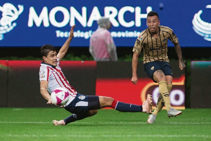 Por si no había quedado claro hace 10 días, Pumas vino al Estadio Akron a derrotar de nueva cuenta a las Chivas, con la misma fórmula y con la misma consecuencia.Porque así como la UNAM eliminó de la Copa a los suplentes de Chivas, anoche venció 2-1 sin cuestionamientos al Rebaño estelar.Treinta y seis años sin ganar al Guadalajara en un partido de Liga en esta ciudad quedaron atrás, ya sin controversias. El resultado ante más de 30 mil aficionados deja a Chivas moribundo en el torneo, pues no sólo no logra meterse a zona de clasificación al quedarse con 15 puntos en la media tabla del campeonato, sino que se relega un poco más cuando el certamen entra en su etapa final.Pumas, todo lo contrario, goza de cabal salud y está entre los cuatro mejores del torneo con 22 unidades.José Cardozo decidió que ya no jugaría este partido con línea de cinco. “Teníamos que proponer el juego, con Gael (Sandoval) y Brizuela (Isaac) por fuera teníamos mano a mano permanente”, explicó el paraguayo al término del partido.Y sí, Chivas fue punzante por las bandas con Sandoval y el “Conejo”, pero a cambio ocurriría algo previsible: Josecarlos Van Rankin, que se agrega muy bien al frente, quedaría exhibido como un débil marcador.Al minuto 6 el juego le dio la razón a Cardozo. Por izquierda Gael Sandoval metió servicio que no alcanzó a rematar Jesús Godínez, pero que quedó para Brizuela, quien no se volvió loco y colocó la pelota cruzada y por arriba, para el 1-0 del Guadalajara.Pero apenas al minuto 15 la lógica le pegó la cachetada a José. Por derecha Alan Mozo se llevó con facilidad a Van Rankin y metió servicio para que Martín Rodríguez, a segundo poste, pusiera en las redes.Chivas fue intenso tras el gol del rival, generó algunas llegadas, pero no volvió a tener la contundencia de su primer ataque. En el complemento, ya sin el aire para mantener la intensidad de la primera parte, Chivas se metió en el juego que buscaba Pumas, de forcejeo en el medio campo.En un juego que se mantenía parejo, la UNAM estableció diferencias con la calidad de sus futbolistas. Así, Van Rankin consiente a Rodríguez hasta que el chileno saca centro por izquierda a su paisano Felipe Mora, quien con gran remate de cabeza coloca la esférica lejos de Gudiño para el 2-1 mortal.El Rebaño tuvo un par de cabezazos en el área con Ángel Zaldívar y Jair Pereira, pero ambos no supieron poner la pelota en las redes. De ahí en más, Chivas se fue diluyendo hasta terminar con la jettatura más longeva del futbol mexicano, además ponerse contra las cuerdas en el tema de clasificar a la Liguilla.No fue el espectáculo que se esperaba y Chivas fue el más afectado. Sí, el local no pudo desplegar el futbol que practica, debido a las condiciones climatológicas, ya que a los cinco minutos que arrancó el duelo, la lluvia hizo acto de presencia. No era copiosa, pero sí constante.Si a lo anterior sumamos que en la tarde por la zona del Bajío, donde se encuentra la casa del rojiblanca, cayó una fuerte tormenta, las condiciones del terreno de juego no fueron las aptas para jugar con balones largos, filtrados debido a lo rápido que estaba el campo.Chivas acostumbra a jugar a ras de pasto, toques en corto, mucha movilidad y eso en esta ocasión falló. Es cierto que Pumas también lo sufrió, pero su propuesta de cotejo era otra, algún vértigo con Pablo Barrera, Alan Mozo o balón al hueco de Ignacion Malcorra.Al medio tiempo, la gerencia del estadio mandó a un equipo de reparación de cinco personas, para darle una peinada a todo el campo, ya que dañado en diferentes áreas, siendo las orillas las más afectadas, que es por donde se jugó en su mayoría.Para el complemento bajó la lluvia, pero el daño estaba hecho, los locales recurrieron poco a tiros de media distancia para buscar que el esférico complicara al arquero Alfredo Saldívar. Pumas lo buscó, pero a cuenta gotas.Por lo resbaloso del campo, el cotejo tuvo muchos errores de ambos equipos en diferentes zonas del campo, demasiados balones perdidos y algunos resbalones. Incluso algunos jugadores conforme avanzó al cotejo, cambiaron de calzado buscando mejor agarre.El manejo del esférico fue bastante complicado para los dos equipos, pero dicho sea de paso, ninguno aprovechó a su favor que el balón corría más rápido.Lo que sí intentaron fueron jugadas de táctica fija desde las afueras del área, acciones aéreas precisamente como marcó Pumas el tanto del triunfo.Al final la entrada no sufrió ya que registró 30 mil 899 asistentes, con muchos aficionados Pumas.José Cardozo al ver que en el primer tiempo Pumas aprovechó las condiciones del campo para cerrar espacios, lo cual provocó desesperación en el equipo porque a ras de pasto era difícil tejer jugadas, mandó al campo a Michael Pérez, para tener mejor control delante de los centrales.Al ver que le estaba ganando de todas, todas a Josecarlos Van Rankin, el técnico David Patiño, le solicitó a Martín Rodríguez que se quedara siempre por izquierda, porque el lateral derecho rojiblanco estaba nervioso y el tiempo le dio la razón, la jugada del segundo gol cayó por ese sector.Patiño desde que cayó el segundo gol tiró a su equipo atrás, metió gente de refresco, hizo una línea de cinco porque Chivas se le iría con todo y buscarían un contragolpe para finiquitar, lo cual sucedió. Le funcionó porque las que generó Chivas no las concretó. 1. Raúl Gudiño, 2. Josecarlos Van Rankin, 4. Jair Pereira, 5. Hedgardo Marín, 6. Edwin Hernández, 11. Isaac Brizuela, 288. Fernando Beltrán, 31. Alan Cervantes, 13. Gael Sandoval, 9. Alan Pulido, 23. Jesús Godínez, DT. José CardozoCambios25. Michael Pérez por 288. Beltrán al 54’ 14. Ángel Zaldívar por 23. Godínez al 73’ 29. Alejandro Zendejas por 13. Sandoval al 841. Alfredo Saldívar;, 2. Alan Mozo, 3. Alejandro Arribas, 4. Luis Quintana, 5. Alan Mendoza, 8. Pablo Barrera, 16. Andrés Iniestr, 10.