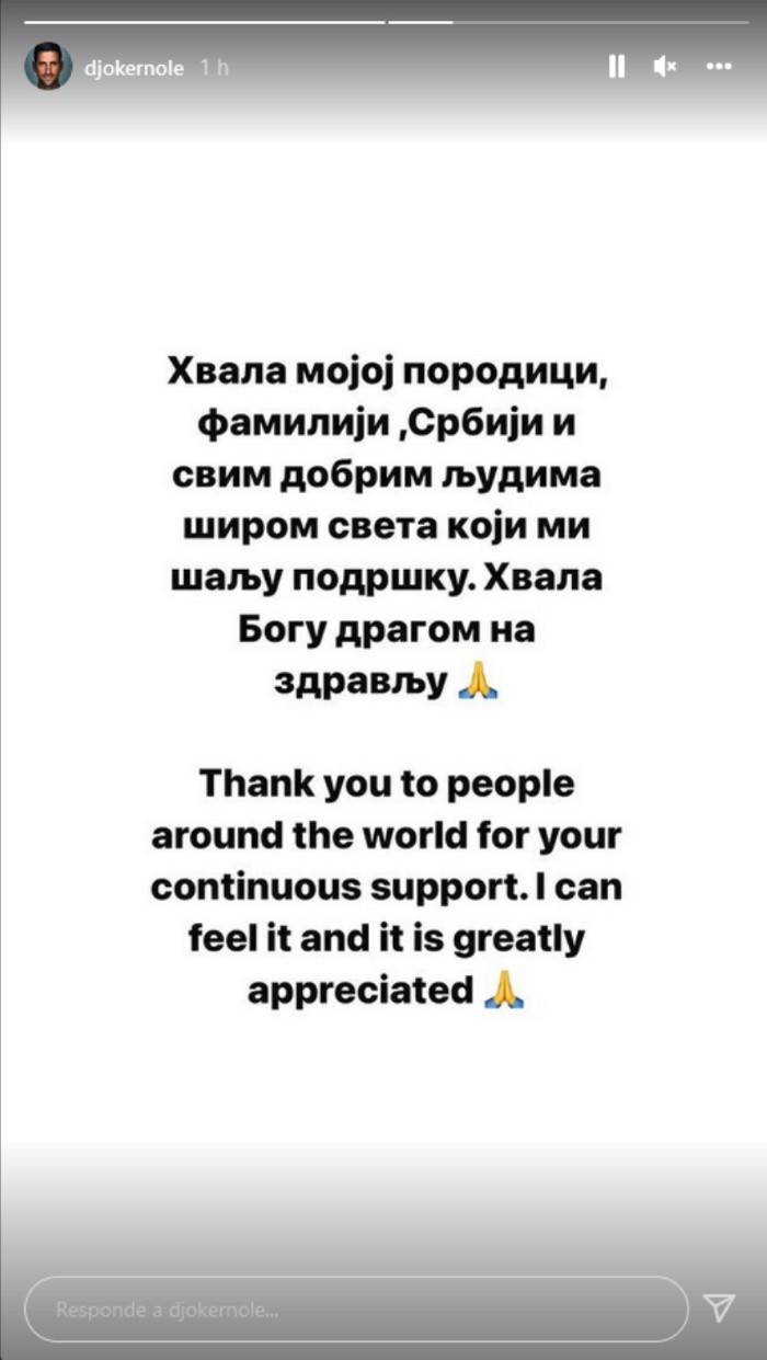 El número del mundo, el tenista serbio Novak Djokovic, publicó su primer mensaje en redes sociales tras haber sido retenido en un hotel de Melbourne. En su cuenta de Instagram, agradeció a quienes "alrededor del mundo" lo apoyan."Gracias a mi familia, a mis amigos, a Serbia, y a toda la gente buena alrededor del mundo que me envía su apoyo. Gracias a Dios por la salud", escribió en un mensaje en serbio.El apoyo, "puedo sentirlo y es enormemente apreciado", escribió también en inglés.El tenista también desea una feliz Navidad a los ortodoxos, después de despertar por segunda vez hoy viernes en un centro de retención de Melbourne, donde el próximo 17 de enero inicia el Abierto de Australia (Open), primer torneo del Grand Slam de 2022.El tenista fue puesto en espera tras una expulsión después de que le fuera anulada la visa de entrada en Australia, en la noche del miércoles al jueves, ya que no cumplía las estrictas condiciones de entrada al país, impuestas en el marco de la lucha contra la pandemia de COVID-19.Según el gobierno australiano, los papeles del tenista de 34 años, que se opuso a la vacunación obligatoria y cuya situación al respecto es desconocida, no respondían a las condiciones exigidas en la materia.El tenista no será expulsado antes del lunes, fecha de una nueva audiencia ante un juez de Melbourne.Novak Djokovic aterrizó en Melbourne el miércoles pasado, con la esperanza de defender su título en el Abierto de Australia (del 17-30 de enero) y de ganar su vigésimo primer título de Grand Slam, tras haber recibido oficialmente una exención médica.OF