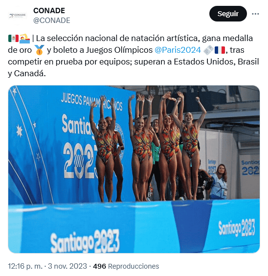 Este viernes 3 de noviembre, la selección mexicana de natación artística realizó la hazaña y ganaron la medalla de oro de los Juegos Panamericanos de Santiago 203 y el boleto para los Juegos Olímpicos de París 2024 al superar en puntos a los favoritos Canadá, Brasil y Estados Unidos.El grupo mexicano obtuvo en la rutina libre un total de 235.7875 unidades, mientras que en la técnica alcanzaron 250.2333.México no asistía como equipo a unos Juegos Olímpicos desde Atlanta 1996, hace 27 años.*Mantente al día con las noticias, únete a nuestro canal de WhatsApp OF