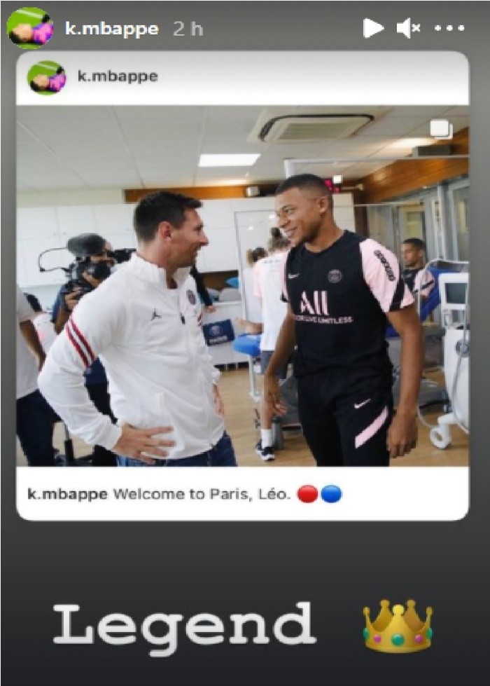 El delantero francés Kylian Mbappé celebró este jueves la llegada al París Saint-Germain (PSG) del argentino Leo Messi, con un mensaje en Instagram en el que le dio la bienvenida y lo calificó de "leyenda"."Bienvenido a París, Leo", le dijo en esa red social, donde mostró varias imágenes juntos, una de ellas abrazados, en el gimnasio del Camp des Loges, donde Messi hizo hoy su primer entrenamiento con los parisinos, con quienes ha firmado por dos temporadas, más una opcional.En sus historias de Instagram, el delantero galo colgó otra de esas fotografías acompañada de la palabra "Leyenda".Mbappé reaccionó a su llegada un día después de la presentación oficial del exbarcelonista en conferencia de prensa, donde el internacional argentino había dicho que estaba muy ilusionado por empezar esta nueva etapa."Leo (Messi) me dijo que venía para jugar con Kylian (Mbappé)", había dicho también ayer en una entrevista a la emisora RMC el catarí Nasser Al-Khelaïfi, presidente del PSG.Mbappé tiene contrato hasta el año que viene y por el momento rechaza prolongarlo."Kylian es parisino, muy competitivo. Ha dicho que quería un equipo competitivo, ahora no hay equipo más competitivo. No tiene excusa para hacer otra cosa", había recalcado también Al-Khelaïfi en la rueda de prensa.El mensaje del natural de Bondy no es la primera reacción de la plantilla respecto a la llegada del argentino."Quién nos lo iba a decir, ¿verdad?", dijo en Instagram el defensor español Sergio Ramos, que a su vez fichó con el equipo el pasado 8 de julio.*****Si quieres tener más contenido, más imágenes y aún más noticias, entonces descarga INFORMAPlus, la aplicación digital de EL INFORMADOR, donde tenemos materiales exclusivos para ti.Descarga la aplicación y pruébala GRATIS por treinta días.Para iOS: https://apple.co/35jaVgbPara Android: https://bit.ly/3gwVSEVSi eres suscriptor de EL INFORMADOR tu acceso está incluido, solicítalo al 33 3678-7777MF