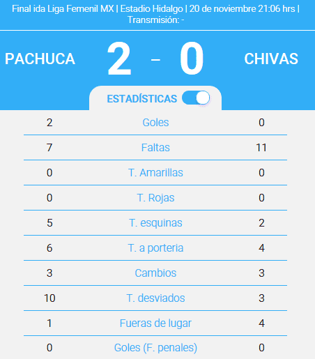 Las Tuzas del Pachuca vencieron a las Chivas del Guadalajara por marcador 2-0 en el partido de ida de la final de la Liga femenil MX disputado en el Estadio Hidalgo.Las Tuzas dominaron gran parte del primer tiempo. Las locales transitaban casi sin oposición por el medio campo e intentaron vencer a la portera rojiblanca, Blanca Félix, con tiros de larga distancia que salieron desviados o fueron resueltos con diligencia por la guardameta.La mejor ocasión del Rebaño llegó al 10, cuando Sánchez filtró un pase para Brenda Viramontes, que no logró rematar con potencia al arco hidalguense.Por un momento, entre el 28' y el 36', Chivas pudo sacudirse el dominio local, pero las Tuzas lograron reflejar en el marcador su superioridad futbolística antes de que terminara la primera mitad.Al minuto 40 Lizbeth Ángeles recibió una asistencia por derecha y remató barriéndose para mandar a los equipos al descanso con las Tuzas aventajadas en el marcador.En la segunda parte Chivas volvió a tener una ocasión clara de gol, pero al 59' la portera de las Tuzas, Alexandría Godínez, evitó lo que parecía el empate para las rojiblancas.El Rebaño no logró controlar el partido y volvió a recibir gol, esta vez al minuto 66 cuando Mónica Ocampo duplicó la ventaja local con un gran cobro de tiro libre.Tuzas y rojiblancas disputarán el partido de vuelta el próximo viernes 24 de noviembre, en el Estadio Chivas, a las 20:06 horas.ALINEACIONESPACHUCA: Godínez; Arellano (Cárdenas, 91'), García (Madrid, 70'), De La Rosa, Gómez, Nieto, Ocampo (Salazar, 77'), Ángeles, Melgoza, Díaz y Muñoz. D.T. Eva Espejo.CHIVAS: Félix; Sánchez (Vázquez, 84'), Morales, Bejarano, Pulido, Viramontes, Duarte, Sánchez, García, Tovar (Padilla, 84') y Benites (Acevedo, 58'). D.T.Luis CamachoÁRBITRO: Lucila Venegas Montes