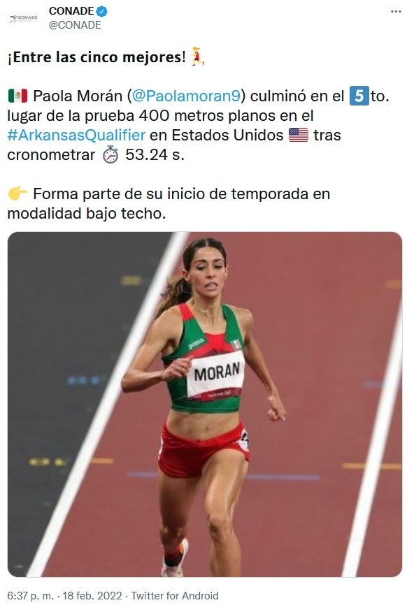 La velocista jalisciense, Paola Morán, logró una destacada actuación en el Arkansas Qualifier de Fayetteville, donde conquistó el quinto lugar en la prueba de los 400 metros planos.La atleta mexicana, semifinalista en los pasados Juegos Olímpicos de Tokio 2020, recorrió el trazado estadounidense con un tiempo de 53.24 segundos, quedando así entre las cinco mejores de un total de 23 corredoras que completaron esta prueba.Una diferencia de 88 centésimas separó a Paola Morán del primer lugar que le perteneció a la estadounidense Kimberly Harris, quien cruzó la línea de meta con un cronómetro de 52.36 segundos para ganar los 400 metros en representación de la Universidad del Sur de California.La competición forma parte del fogueo internacional de la velocista jalisciense que continúa con su preparación rumbo al Campeonato Mundial de Atletismo en Pista Cubierta, mismo que se disputará entre el 18 y 20 de marzo desde Belgrado, Serbia.OA