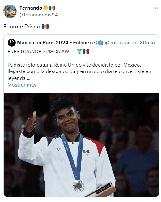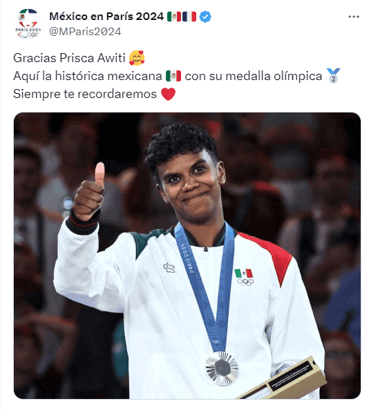 Este martes 30 de julio, Prisca Awiti hizo historia al ser la primera atleta nacional en ganar una medalla en la disciplina de Judo en Juegos Olímpicos. Pese a que cayó en su combate, la final ante la eslovena Andreja Leski, la nacida en Londres, pero de madre mexicana, se quedó con la medalla de plata en París 2024.Aunque el haber clasificado hasta el combate definitivo, Prisca Awiti hizo que los aficionados mexicanos soñaran en grande. Si bien el judo no es un deporte muy popular en el país, quienes se levantaron temprano y vieron sus combates fantasearon con que cayera en sus manos la presea dorada, que finalmente terminó por ser de plata.En redes sociales los mensajes de felicitación y las celebraciones no faltaron. Hasta el momento, la delegación mexicana acumula dos medallas en lo que va de París 2024. El pasado sábado, el equipo femenino de tiro con arco logró la presa de bronce al vencer en su serie a Países Bajos. Hoy se sumó la plata de Prisca Awiti en judo, que mantuvo al borde del asiento a los fanáticos y se quedó finalmente con el segundo lugar.*Mantente al día con las noticias, únete a nuestro canal de WhatsAppOF