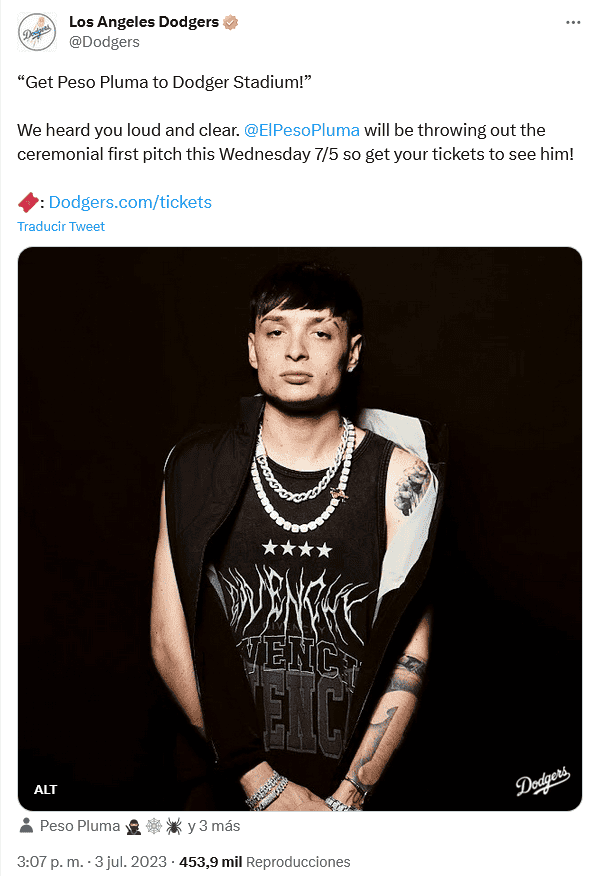 La polémica se ha desatado en redes sociales, luego de que el equipo de Los Angeles Dodgers informara que el famoso cantante mexicano Peso Pluma será el encargado de lanzar la primera bola en el partido del miércoles 5 de julio ante los Pittsburgh Pirates en el Dodger Stadium."Los escuchamos alto y claro. @PesoPluma hará el primer lanzamiento ceremonial este miércoles 5 de julio, ¡Así que obtengan sus boletos para verlo", informaron los Dodgers en sus redes sociales.También, los Dodgers compartieron en sus cuentas oficiales un video en el que se puede ver al pitcher Shelby Miller diciendo que sería genial encontrarse con Peso Pluma, debido a las constantes comparaciones que otros jugadores latinos hacen entre ellos dos. Para muchos seguidores del equipo, en efecto, el lanzador sí se parece físicamente al intérprete de corridos tumbados. Peso Pluma ha roto récords con sus canciones a nivel mundial y, es uno de los intérpretes con más reproducciones en la Lista Global de Spotify.El mexicano Ramón Ayala fue otro de los músicos que han lanzado la primera bola en un partido de los Dodgers. Su participación fue apenas el pasado mes de abril.El tercer partido de la serie Dodgers vs Pirates será este miércoles 5 de julio a las 20:10 horas en el Dodger Stadium.OF