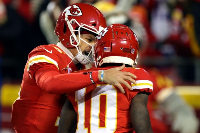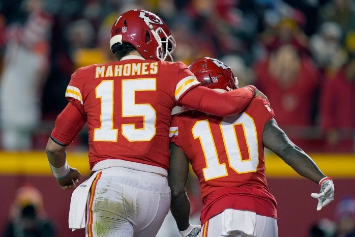 Patrick Mahomes lo ha vuelto a hacer. Kansas City Chiefs venció 42-36 a Buffalo Bills en el tiempo extra y se metió al Juego de Campeonato de la AFC tras un espectacular partido en Arrowhead. Con el triunfo, Kansas City liga su cuarta Final de Conferencia al hilo y Patrick Mahomes levanta la mano para ganar su segundo anillo en su carrera. Antes deberán vencer a Cincinatti Bengals. Los Chiefs perdieron la de 2019 ante los Patriots; luego ganaron el título de la AFC en 2020 a los Titans y en 2021 a los Bills.El duelo entre los pasadores de las dos mejores ofensivas de la NFL en los playoffs de esta temporada; Buffalo número uno, y Kansas City, dos; no defraudó.Por los Chiefs Patrick Mahomes, 26 años, cuarto con más yardas en la liga, 4.839; pasó para 378 y tres anotaciones. Con los Bills Josh Allen, 25 años; octavo en yardas en el año, 4.407; acumuló 329 yardas por aire, cuatro TD.Buffalo celebró con su primer ataque que culminó con TD por tierra de Devin Singletary para ponerse arriba por siete puntos.Kansas City respondió de la mano de su pasador, quien resolvió con una jugada personal la llegada a las diagonales; 7-7.En el segundo cuarto los Chiefs volvieron a establecer una larga ofensiva de 86 yardas y 12 jugadas que terminó con festejó en la zona de anotación del receptor Byron Pringle, quien atrapó el envío de Mahomes para dar la ventaja al local 14-7.Si el trabajo de Mahomes fue sobresaliente en la primera mitad, Josh Allen no se quedó atrás al conectar su primer pase de anotación con Gabriel Davis que igualó el duelo en 14 puntos.Kansas City empezó explosivo el tercer cuarto. Convirtió un gol de campo para tomar distancia 17-14, y una serie ofensiva después alargó la ventaja 23-14 con pase de anotación para Mecole Hardman.Buffalo respondió con el envío más largo de la temporada de Josh Allen, fue de 49 yardas para Gabriel Davis, quien los acercó 23-21.En el último periodo un regreso de patada de 45 yardas de Tyreek Hill colocó a los Chiefs dentro de la yarda 20 del visitante, posición de campo que aprovecharon para sumar tres puntos; 26-21.Jugada clave en el partido fue la que se presentó a los Bills en cuarta oportunidad y 17 por avanzar, en la que el dueño del jersey número 17 encontró en la zona de anotación a Gabriel Davis para tomar el control del juego 29-26 a favor de Buffalo.Mahomes regresó al campo con menos de dos minutos para el final. Inició su ofensiva en la yarda 25 de su campo, llevó a su equipo a la anotación con un envío a Tyreek Hill y devolvió la ventaja a los Chiefs de 33-29.Josh Allen contó con 60 segundos en su última ofensiva, suficientes para cruzar el campo y mandar un pase de TD a Gabriel Davis que dio otro vuelco al marcador 36-33 a favor de los Bills.Con sólo 13 segundos Patrick Mahomes arrastró a la defensiva rival de su yarda 25 a la 30 del oponente. Desde ahí su pateador Harrison Butker conectó un gol de campo de 49 yardas que igualó el choque, 36-36, y lo mandó a tiempo extra.En la primera ofensiva del periodo extra el portador del Jersey 15 del equipo local conectó con su ala cerrada Travis Kelce para llevarse una dramática victoria por 42-36.JL