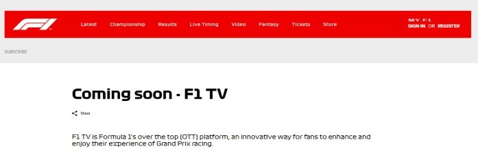 Este miércoles, la revista Motorsport informó que Liberty Media, propietario de la Fórmula 1, podría no lanzar este fin de semana el servicio de televisión que estaría disponible a partir de la primera carrera del campeonato en Australia y que mostraría a los aficionados las competencias sin difusor intermediario.La plataforma estaría disponible desde la primera fecha de la competencia en algunos países, y aunque hasta ayer martes se podía ingresar a la página para averiguar los precios de la suscripción, este día aparece el sitio en blanco mostrando sólo un mensaje de error.Para esta fecha sólo se llevarían a cabo pruebas en tiempo real, por lo que las suscripciones están inhabilitadas y hasta el momento no se dicho cuándo el proyecto ''F1 TV'' estará listo para ser utilizado.Recuerdan que los primeros suscriptores podrán ingresar a la plataforma a través de sus computadoras, y más adelante el servicio estará disponible en celulares y tabletas.OF