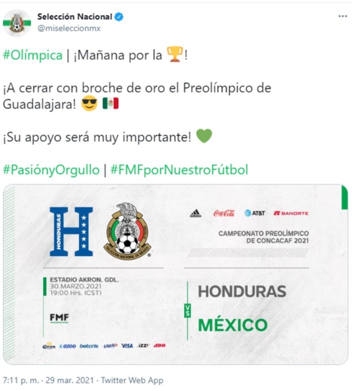 La Selección Mexicana Sub-23 ya tiene su boleto a los Juegos Olímpicos de Tokio 2020, luego de vencer 2-0 a Canadá en las semifinales del torneo Preolímpico. México, dirigido por Jaime Lozano, quiere terminar de la mejor manera el certamen disputado en Guadalajara y esta noche buscarán el título ante Honduras.El cuadro hondureño se metió a la final, luego de vencer 2-1 a la Selección de Estados Unidos en el Estadio Jalisco.Ahora, ambas selecciones con boleto en mano rumbo a Tokio 2020, buscarán ser los mejores de la categoría en Concacaf.OF