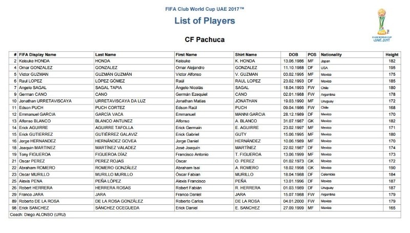 Con equipo de lujo, incluidos el japonés Keisuke Honda, el argentino Franco Jara y los mexicanos Óscar Pérez y Erick Gutiérrez, el equipo Pachuca dio a conocer su lista de 23 jugadores para el Mundial de Clubes de Emiratos Árabes Unidos 2017.La Federación Internacional de Futbol Internacional (FIFA) publicó las listas definitivas de los siete participantes en la justa que se realizará del 6 al 16 de diciembre próximo.Tuzos, campeón de la Concacaf, contará con jugadores como Franco Jara, quien hizo seis goles en la Liga de Campeones de la zona, además de la estrella japonesa Keisuke Honda, quien ha dado muestras de su calidad en el equipo.También están el "Conejo" Pérez, quien jugaría el último torneo de su carrera profesional, y jóvenes como Erick Gutiérrez y Roberto de la Rosa, este de apenas 17 años, todos dirigidos por el técnico uruguayo Diego Alonso.El equipo mexicano debutará en la justa el 9 de diciembre, cuando se mida al Wydad Athletic Club en el Zayed Sports City Stadium de Abu Dhabi, en busca del boleto a semifinales, donde se mediría con el Gremio de Porto Alegre, monarca de la Copa Libertadores.Lista de jugadores convocados por Pachuca para el Mundial de Clubes 2017:1. Keisuke Honda 2. Omar González 3. Víctor Guzmán 4. Raúl López 5. Ángelo Sagal 6. Germán Cano 7. Jonathan Urretaviscaya 8. Edson Puch 9. Emmanuel García 10. Alfonso Blanco 11. Erick Aguirre 12. Erick Gutiérrez 13. Jorge Hernández 14. Joaquín Martínez 15. Tony Figueroa 16. Óscar Pérez 17. Abraham Romero 18. Óscar Murillo 19. Alexis Peña 20. Robert Herrera 21. Franco Jara 22. Roberto de la Rosa 23. Erick Sánchez OF
