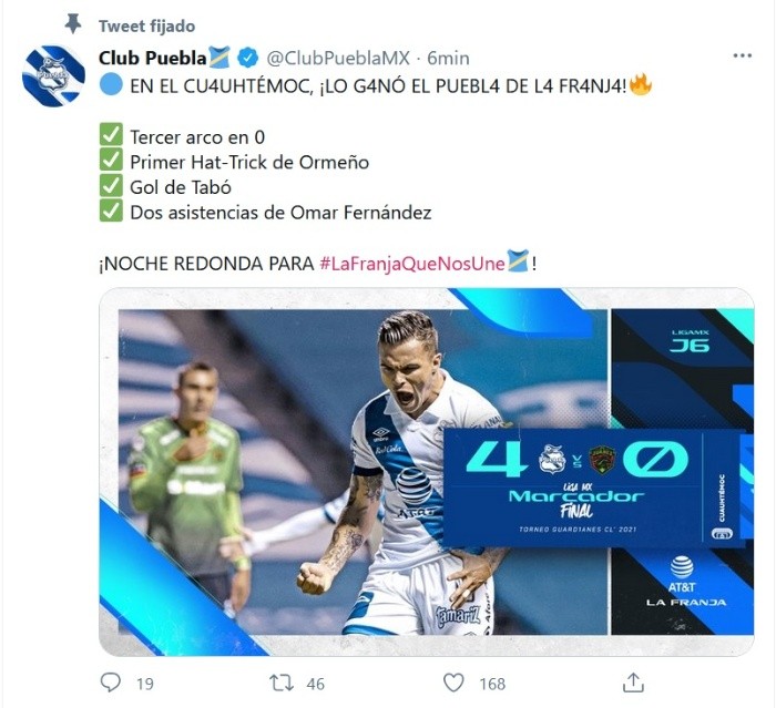 El Puebla goleó 4-0 a los Bravos de Ciudad Juárez con tres goles del delantero mexicano Santiago Ormeño, en el arranque de la jornada 6 del Torneo Guardianes 2021.Los fronterizos tuvieron una actuación para el olvido, ya que apenas al minuto cuatro ya estaban debajo del marcador. Ormeño hizo su primer gol de la noche en una jugada individual, al superar a los zagueros de Juárez y plantarse al fondo de la cancha ante el guardameta Enrique Palos y aprovechar su mala salida para colocar el balón en el hueco que dejó el portero y el primer palo.Con el tanto tan tempranero los visitantes se descontrolaron, pero trataron de reponerse y con orden se lanzaron al ataque; sin embargo, un contragolpe que concluyó con el gol de Christian Alejandro Tabó, al minuto 42, dejó a los Bravos en la lona.Al iniciar la segunda parte, los dirigidos por Luis Fernando Tena intentaron meterse de nuevo en el encuentro, a la vez que la lluvia se hacía presente en el estadio Cuauhtémoc, pero de nueva cuenta un error en la defensa sepultó las posibilidades fronterizas.Al 47' el defensa Alberto Acosta derrumbó dentro del área a George Corral para que el silbante Fernando Hernández marcara penal, mismo que transformó Ormeño con un potente disparo para el 3-0 al 50'.El delantero poblano Santi Ormeño cerró su "hat trick" al 69 tras otra grave falla de los Bravos en su parte baja, el colombiano Omar Fernández se escapó por el sector derecho, se quitó a defensa y cedió para Ormeño, quien sólo empujó el balón al fondo de la red. Con el resultado, el Puebla alcanzó los ocho puntos, mientras que Juárez se estancó en cinco.JM