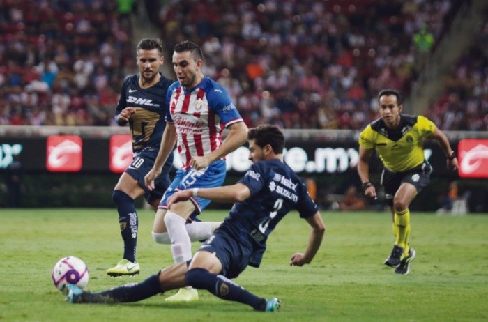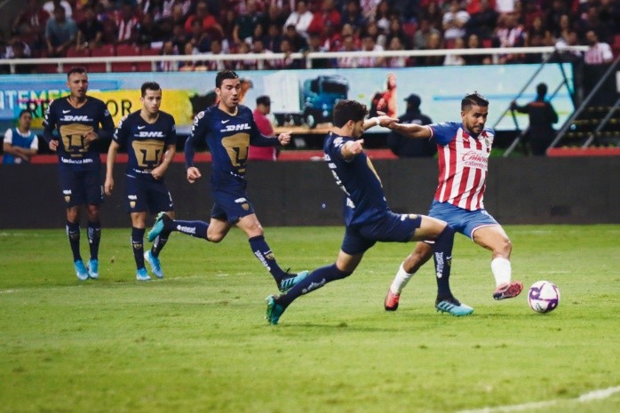 El Guadalajara no levanta, ni siquiera frente a unos inoperantes Pumas que se valieron de su único acierto del partido en los minutos finales para sacar un punto de su visita al estadio Akron, al terminar 1-1 el encuentro de anoche.Chivas llegaba a este cotejo con una seguidilla de tres derrotas y el resultado de ayer de poco o nada sirve para mantener vivas sus aspiraciones de Liguilla, pues con sólo 12 puntos el cuadro rojiblanco sigue en los últimos puestos de la tabla general y del cociente.El Rebaño tampoco hizo grandes méritos para llevarse los tres puntos. Obligado por las bajas por suspensión, Luis Fernando Tena presentó una alineación inédita, con Hiram Mier en la central y plantando a Alejandro Mayorga desde inicio como lateral, ubicando a Miguel Ponce como volante.La alineación no le rindió frutos al local, que poco pudo hacer para inquietar el marco de Alfredo Saldívar. Lo mismo se puede decir del cuadro capitalino, que se mostró falto de intensidad en la primera parte, algo que el Guadalajara no supo aprovechar.Sin embargo, Chivas se encontró el gol de la ventaja gracias a un regalo del central Jorge Isaac Rojas. Sobre el minuto 32, Alan Pulido cayó en el área chica y el árbitro se valió del VAR para marcar la pena máxima por un supuesto jalón de Luis Quintana, en una jugada en la que el delantero rojiblanco tropezó consigo mismo. Fue el propio Pulido el que convertiría tres minutos después.El complemento inició con mayor ímpetu, pues ambos conjuntos se volcaron al ataque, aunque la visita seguía mostrando menos claridad, lo que abría la posibilidad de que el Guadalajara encontrara un respiro.Pero la historia cambió al minuto 73, cuando Alexis Vega dejó en desventaja a su equipo, luego de que Rojas juzgó como intencional un pisotón que el atacante tapatío le propinó a Alan Mozo.A partir de entonces Chivas perdió el control del partido y la concentración. En tiempo de compensación Carlos González remató de cabeza, de espaldas al marco y desde el área grande, un servicio de más de 40 metros que agarró mal ubicado a Antonio Rodríguez, decidiendo así el partido y quizá el destino del Guadalajara: la eliminación.Cerca En el arranque del segundo tiempo Chivas estaba encima de Pumas. Alejandro Mayorga llegó con constancia por sector izquierdo y al minuto 54 sacó un disparo que se fue cerca del arco defendido por Alfredo Salvídar, en el que era el mejor momento de los tapatíos, aunque no lo reflejaron en el marcador.Ajuste infructuoso Tras la expulsión de Alexis Vega, Chivas tuvo que rectificar y mandó a un contención para aguantar el resultado, al entrar Michael Pérez para mantener el mediocampo. No fue exitoso el movimiento de Luis Fernando Tena, pues Pumas empezó a atacar por los costados, forzando el error del local.Planteamiento inofensivo El técnico de Chivas, Luis Fernando Tena, mandó de inicio un esquema para contrarrestar el aparato ofensivo de Pumas, pero perdió al ataque, porque sus laterales estaban más concentrados en que no llegara el enemigo y durante el desarrollo del partido se olvidaron de aportar algo al frente.Guadalajara.- José Rodríguez, Jesús Sánchez, Oswaldo Alanís, Manuel Mayorga, Hiram Mier, Miguel Ponce, Jesús Molina, Dieter Villalpando (Michael Pérez, 77), Isaac Brizuela, Alexis Vega y Alan Pulido (César Huerta, 82). DT, Luis Fernando Tena.Pumas.- Alfredo Saldívar, Alan Mozo, Luis Quintana, Nicolás Freire (Pablo Jaquez, 28), Jeison Angulo (Bryan Mendoza, 70), Juan Pablo Vigón, Andrés Iniestra, Víctor Malcorra, Brian Figueroa (Felipe Mora, 57), Juan Iturbe y Carlos González. DT. Miguel González "Míchel" (ESP).