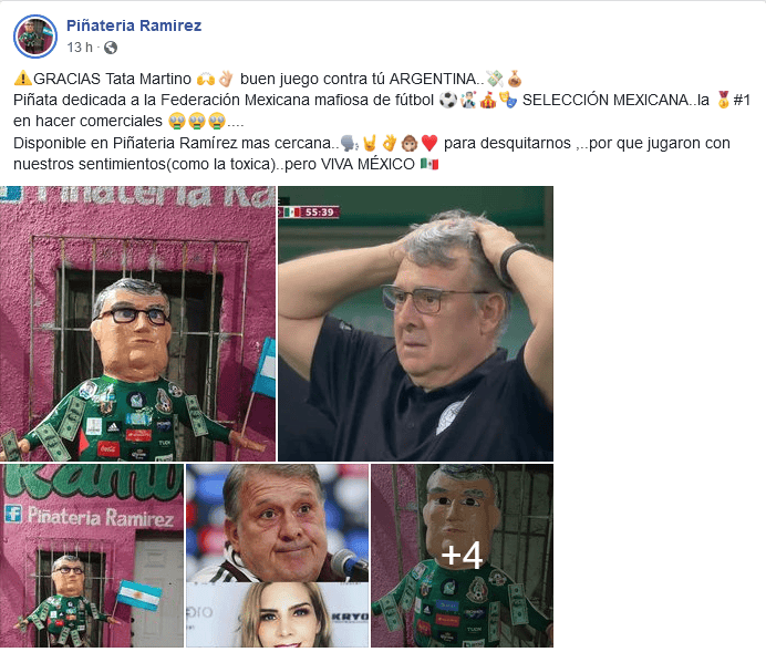¡Dale, dale, dale! Luego de la eliminación de la Selección Mexicana en el Mundial de Qatar 2022, la Piñatería Ramírez, famosa por diseñar todo tipo de personajes, creó la piñata de Gerardo "Tata" Martino.Por medio de Facebook, la piñatería compartió el trabajo que realizó con todo lo que caracterizó al ahora ex entrenador de México en todo su proceso."GRACIAS Tata Martino buen juego contra tú ARGENTINA... "Piñata dedicada a la Federación Mexicana mafiosa de fútbol. SELECCIÓN MEXICANA... la #1 en hacer comerciales... Disponible en Piñatería Ramírez más cercana... para desquitarnos... por que jugaron con nuestros sentimientos (como la toxica) ...pero VIVA MÉXICO", se lee en la publicación.La piñata del técnico argentino contiene billetes y marcas de publicidad pegados en su cuerpo; además del escudo de la Selección de Argentina y tiene agarrada una bandera de su país.Sólo había que hacerlo oficial, aunque el mismo Gerardo Martino lo había adelantado, saltándose las normas. El Tata está fuera de la Selección Mexicana, no se le renovará el contrato. Su situación es insostenible.Jaime Ordiales trató de ser diplomático a la hora de anunciar la no renovación del técnico argentino: "Lo reconocemos como un gran técnico, que tiene un gran cuerpo técnico, trabajador, muy capaz. Pero si no se alcanzan los resultados, es complicado (seguir). Él lo manifestó el pasado miércoles. Fallamos todos, es verdad y quizá hay que valorar los procesos, pero los resultados son los que mandan".OF