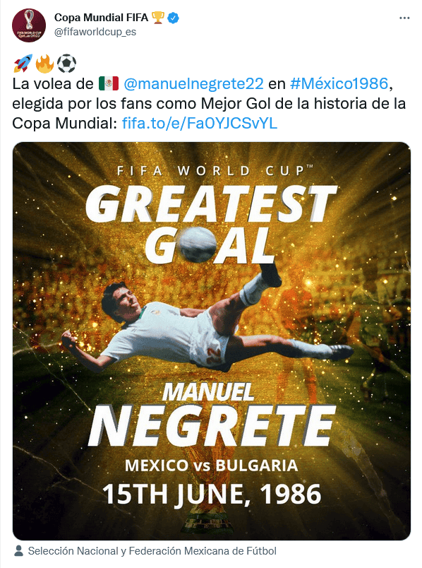 A solo 100 días para el Mundial de Qatar 2022, te dejamos 100 datos que debes saber de Copas del Mundo.El mejor gol anotado en la historia de los Mundiales fue anunciado el 8 de abril de 2018 por la FIFA, luego de que concluyera un concurso en el que estuvieron sometidos a votación una serie de tantos.Hace cuatro años, la FIFA informó que el tanto anotado por el mexicano Manuel Negrete en la fase de octavos de final de la Copa del Mundo de México 1986 fue elegido por los aficionados como el mejor de la historia de la justa.El gol de media volea de Manuel Negrete ante la Selección de Bulgaria (duelo que México se impuso por 2-0) triunfó en la votación en la que compitió contra otros 31 tantos de diferentes torneos.En aquella ocasión, la FIFA determinó que el mejor gol anotado en Copas del Mundo fuera elegido democráticamente, por lo que para muchos que no estuvieron de acuerdo con la decisión es solo el más popular.En la final por ser el mejor, la diana del encuentro disputado en el Estadio Azteca, se impuso al que el brasileño Éder marcó desde fuera del área al portero soviético Rinat Dasáev en España 1982.El mexicano también superó un gol de Pelé contra Suecia en el Mundial de 1958; el legendario gol de Maradona contra Inglaterra, también en el Mundial de México 1986; uno de Dennis Bergkamp contra Argentina en Francia 1998; el del argentino Maxi Rodríguez en Alemania 2006, incluso al de James Rodríguez contra Uruguay en Brasil 2014.La encuesta se realizó a través de la página de Facebook de la FIFA, y en ella participaron cientos de miles de seguidores desde el pasado 31 de marzo y hasta el 8 de abril de 2018.OF