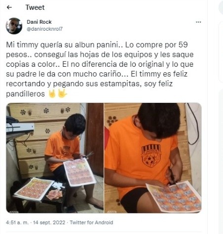 La Copa del Mundo de Qatar 2022 inicia el 20 de noviembre próximo, mientras tanto los aficionados mexicanos tratan de llenar su álbum mundialista. En las últimas semanas se ha informado que las personas hacen hasta lo imposible con conseguir las estampas a pesar de su elevado costo en el que se venden.La edición actual del álbum y su caja de sobres cuesta más de dos mil pesos, precio que no se encuentra dentro de las posibilidades de todos los mexicanos que además tienen que enfrentar la inflación en alimentos, gasolinas y otros productos.Pero la falta de recursos no siempre es un obstáculo para lograr lo que te propones, como en el caso de Daniel, un papá mexicano que cumplió el sueño de su hijo de tener un álbum del mundial. El padre sorprendió a Timmy, su hijo con su álbum con costo de 59 pesos y la impresión de todas las estampas en hojas blancas, mismas que le ayudó a recortar con mucho cariño.Esta historia se hizo viral en las redes sociales, donde la publicación tiene casi 3 mil likes y 155 comentarios.