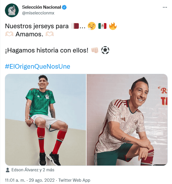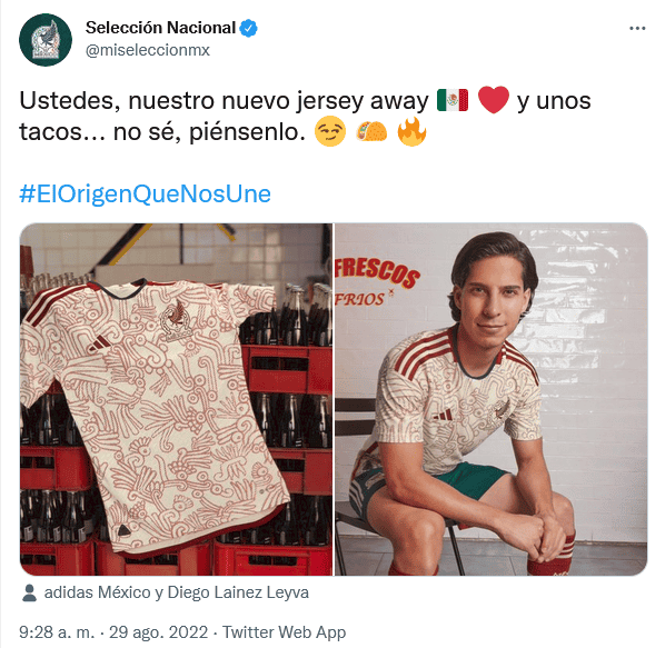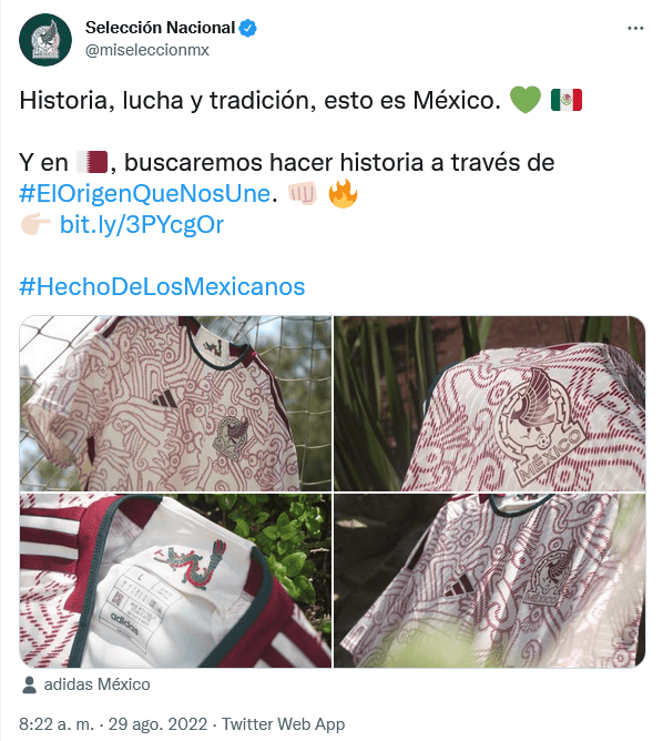 Ahora sí, ya es oficial el segundo uniforme que utilizará la Selección Mexicana en la Copa Mundial de Qatar 2022.Este lunes muy temprano la marca Adidas, que viste al Tricolor desde hace algún tiempo, reveló el otro jersey que tendrá el cuadro de Gerardo "Tata" Martino para la justa a disputarse en Doha en noviembre y diciembre de este año.Esta marca alemana explicó en qué está basada esta camiseta: "Inspirado en los abundantes elementos gráficos de la memoria colectiva prehispánica de México. La nueva camiseta de visitante representa las raíces indígenas".También se ha dado a conocer el precio de los jerseys que acaba de lanzar la marca.El de aficionado tiene costo de mil 799 pesos, mientras que el de jugador está en dos mil 699 pesos.OF