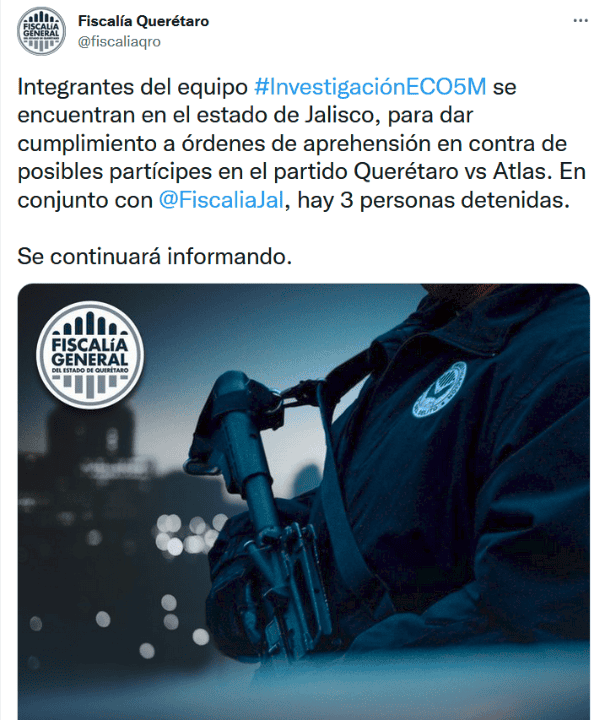 Este miércoles la Fiscalía de Querétaro y su homóloga en Jalisco confirmaron la detención de tres aficionados del Atlas, quienes presuntamente participaron en los hechos violentos ocurridos el pasado 5 de marzo en el Estadio La Corregidora, durante el encuentro entre los rojinegros y los Gallos Blancos.Se trata de Jovany Daniel M. de 21 años, Daniel C. de 36 años y Luis Ángel V. de 21 años, quienes serán puestos a disposición de la autoridad judicial de Querétaro para que continúe con la investigación iniciada por lo ocurrido en La Corregidora.La Fiscalía de Jalisco aseguró que han mantenido estrecha comunicación con el estado de Querétaro “con la finalidad de colaborar en todo lo que fuera necesario en la investigación que se estaba llevando a cabo”.“Derivado de ese trabajo coordinado, la dependencia estatal había recibido tres colaboraciones por parte de la Fiscalía queretana con la finalidad de realizar diversos actos de investigación para la identificación de diferentes personas que presuntamente participaron en los actos violentos durante el partido de futbol celebrado en esa entidad y que se presumía tenían su residencia en el estado de Jalisco”, dijo la Fiscalía del Estado.En días pasados, aseveró, se recibió una cuarta solicitud de colaboración en la que se solicitaba el cumplimiento de órdenes de aprehensión en contra de las tres personas ya señaladas, quienes son investigadas en Querétaro por su probable participación en los hechos ocurridos en La Corregidora.“Por tal motivo se implementó un operativo en diversos puntos del Área Metropolitana de Guadalajara, logrando la detención de las tres personas, quienes serán puestos a disposición del órgano jurisdiccional de Querétaro”, señaló la Fiscalía de Jalisco.Serán las autoridades queretanas quienes se encarguen de determinar su participación en el conflicto ocurrido el pasado 5 de marzo, así como de informar los delitos que se les imputan a las tres personas antes señaladas.De acuerdo con la Fiscalía de Querétaro, hasta el pasado 20 de abril se habían vinculado a proceso a 34 personas por estos hechos, por los delitos de apología del delito, violencia en espectáculos deportivos, homicidio en grado de tentativa, abuso de poder y contra la administración de justicia.Además, señaló, se llevaron a cabo 51 cateos en seis municipios de ese estado, incluyendo las instalaciones del Club Deportivo Gallos Blancos y de la Empresa de Seguridad Privada contratada para “brindar seguridad” en ese partido.GC