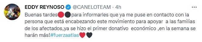 Como fiel aficionado rojinegro, Eddy Reynoso se solidarizó con la causa de las personas que fueron lesionadas durante el juego entre Querétaro y Atlas.A través de sus redes sociales, el entrenador del boxeador mexicano Saúl “Canelo” Álvarez dio a conocer que realizó un donativo a beneficio de los aficionados que fueron agredidos por los porristas de los Gallos Blancos.“Buenas tardes, para informarles que ya me puse en contacto con la persona que está encabezando este movimiento para apoyar a las familias de los afectados, ya se hizo el primer donativo económico y en la semana se harán más. Fuerza Atlas”, escribió el entrenador.Reynoso también adelantó que durante la semana seguirá aportando para esta causa, pues aún existen aficionados del Atlas que se encuentran internados en el Hospital Regional de Querétaro luego de ser brutalmente golpeados en su visita al Estadio de La Corregidora.En contraparte, este día se dio a conocer que 19 de las personas agredidas durante el partido de Querétaro contra Atlas ya fueron dadas de alta.JL