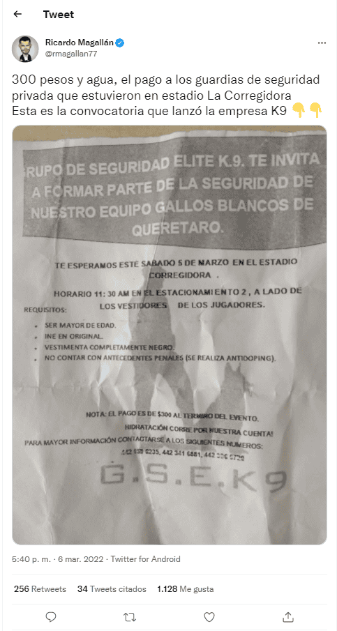 Los hechos violentos que se suscitaron el pasado 5 de marzo de 2022 en la ciudad de Querétaro durante el encuentro de los Gallos Blancos y Atlas, han conmocionado a aficiones, autoridades y sociedad, que en redes sociales comparten imágenes lamentables, buscan ayudar y difunden información al respecto.Entre la información que circula destaca el supuesto pago que la empresa de seguridad privada contratada habría ofrecido a quienes atendieran su convocatoria para el encuentro en el Estadio Corregidora de acuerdo con una fotografía compartida en Twitter por el reportero Ricardo Magallán este domingo. "Grupo de Seguridad Elite K.9 te invita a formar parte de la seguridad de nuestro equipo Gallos Blancos de Querétaro" se lee en el encabezado de un volante.En dicha convocatoria se llama a presentarse "este sábado 5 de marzo en el Estadio Corregidora" a las 11:30 de la mañana en el “estacionamiento 2, junto a los vestidores de los jugadores”. Entre los requisitos destacan: ser mayor de edad, INE en original, vestimenta de color negro, no contar con antecedentes penales y realizarse un examen antidoping.El documento da a conocer además el pago que supuestamente se otorgaría a quienes atendieran dicha convocatoria: "El pago es de $300 al término del evento", se especifica. "Hidratación corre por nuestra cuenta! (sic)", incluye, así como los números telefónicos de la empresa para que los interesados se pusieran en contacto.Entre las reacciones a la publicación de Magallán sobresalen testimonios que señalan que lo mismo ocurre en encuentros de otros partidos en otros estadios, que hay incluso eventos a los que los empleados tienen que llevar su propia agua. La usuaria Karen HT atinó a señalar “Es un chiste verdad? Nuestra seguridad en los estadios depende de gente sin experiencia y sin previo entrenamiento/capacitación, qué mal estamos @LigaBBVAMX ojo aquí @fifaworldcup_es por que será igual para el mundial (sic)”."Por esto! Acuden como seguridad gente del mismo equipo, sin un mínimo de preparación y conocimiento. Cuando deberían contratar profesionales avalados, que no estén a favor de ninguno de los dos equipos. Por eso les abren las puertas, por eso les dejaron meter todo tipo de armas", lamenta Grazzia Ulloa.De acuerdo con las cifras compartidas por las autoridades, las agresiones que tuvieron lugar en las inmediaciones del Corregidora el sábado pasado dejaron un saldo de 26 personas heridas; al corte de este lunes se informa que 19 de ellas ya han sido dadas de alta.