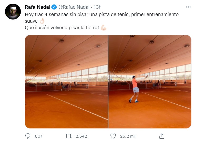 A través de sus redes sociales, el tenista ibérico, Rafael Nadal, anunció su regreso a los entrenamientos luego de que sufriera una lesión en una costilla que lo dejó fuera un mes. El tenista se mostró ilusionado con su regreso y apunta a llegar a tiempo y en buena forma para disputar el segundo Grand Slam del año, Roland Garros. “Hoy (ayer), tras cuatro semanas sin pisar una pista de tenis, primer entrenamiento suave. ¡Qué ilusión volver a pisar la tierra!”, escribe Nadal en Twitter con dos fotos suyas ejercitándose.Nadal había anunciado el 22 de marzo que sería baja entre cuatro y seis semanas debido a una “fisura en una costilla” contraída en Indian Wells.Tras haber batido en Semifinales a su compatriota Carlos Alcaraz, perdió en la Final frente a Taylor Fritz y se supo su lesión dos días más tarde.Tras ese anuncio, se perdió los Masters 1000 de Miami, en superficie dura, y Montecarlo, que abrió la temporada europea de tierra batida.Tras haberse perdido el inicio de la temporada en tierra batida, el número tres mundial, podría regresar a las pistas en Madrid y también disputar el Masters 1000 de Roma.JL