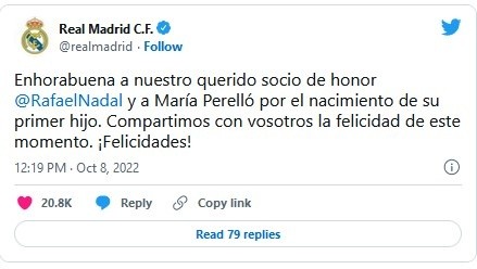 El tenista español Rafael Nadal y su esposa, Mery Perelló, se convirtieron en padres de un niño este sábado en una clínica privada en Palmar de Mallorca, España.Una noticia que cautivó a sus fanáticos, quienes mediante las redes sociales han mandado mensajes de felicitaciones para la pareja, que lleva tres años de matrimonio y dos décadas de relación.Dentro de los mensajes de felicitación para la feliz pareja, resaltó el realizado por la cuenta oficial de Real Madrid, equipo del que Rafael Nadal es aficionado y socio de honor."Enhorabuena a nuestro querido socio de honor Rafael Nadal y a María Perelló por el nacimiento de su primer hijo. Compartimos con vosotros la felicidad de este momento. ¡Felicidades!", se puede leer en el mensaje.Después de pasar unos días con su primogénito, Rafael Nadal volverá a la competición para disputar el Masters 1000 de París a finales de octubre.JM