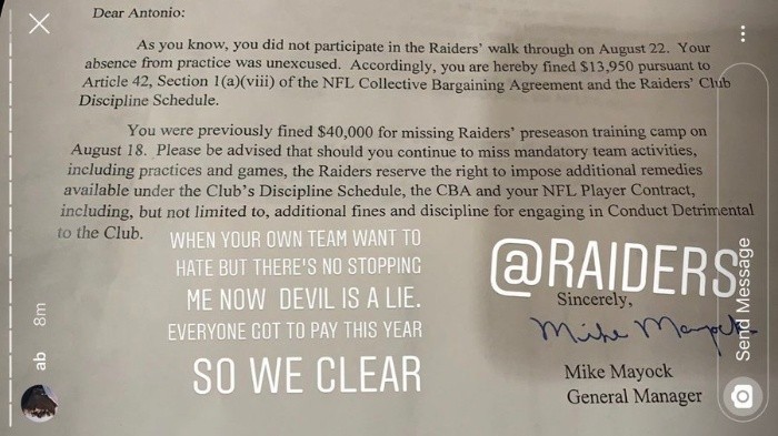 A un día de que comience la temporada 100 de la NFL, los Raiders de Oakland podrían suspender a Antonio Brown, luego de que este tuviera una discusión con el gerente general Mike Mayock.De acuerdo con información de Adam Schefter de ESPN, el receptor y Mayock tuvieron un choque el miércoles, el cual habría terminado con una sanción para el jugador que llegó esta temporada al equipo, procedente de los Pittsburgh Steelers.''Alrededor de la Liga hay quienes ahora creen que los Raiders podrían suspender a Antonio Brown con la idea de intentar anular los 30.125 millones (de dólares) garantizados en su contrato. Lo que obviamente terminaría su tiempo en Oakland'', dice el periodista en Twitter.Posteriormente, Brown publicó en su cuenta de Instagram una historia en la que se aprecia la imagen de un aviso y el mensaje: ''cuando tu propio equipo quiere odiarte pero no me pueden detener. El diablo es una mentira. Todos me las pagarán este año, ténganlo claro''.Brown ha enfrentado numerosos incidentes en su carrera. El más reciente se suscitó tras su arribo a Oakland, debido a su negativa a utilizar un modelo de casco autorizado por la Liga.OF