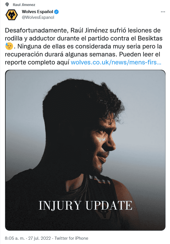 ¡Las alarmas se encienden para el Wolverhampton! Pero también para la Selección Mexicana, en un semestre tan importante para Raúl Jiménez, porque el Mundial de Qatar 2022 está a la vuelta de la esquina.El conjunto de la Premier League informó en un comunicado el pronóstico de Raúl Jiménez, quien sufrió una lesión en la rodilla y aductor, pero aunque no es de gravedad, sí estará fuera de acción por varias semanas."Desafortunadamente, Raúl Jiménez sufrió lesiones de rodilla y aductor durante el partido contra el Besiktas. Ninguna de ellas es considerada muy seria, pero la recuperación durará algunas semanas", informaron los Wolves.El delantero mexicano estaba teniendo una buena pretemporada con el Wolverhampton al hacerse presente en el marcado en algunos de sus partidos, incluido con el Besiktas de Turquía en el que salió de cambio al minuto 33.El atacante surgido del América estaba en busca de recuperar su nivel para llegar de gran forma a Qatar 2022, pues algo que ha sufrido la Selección Mexicana en los últimos meses es la falta de gol, misma que sufrió Jiménez la temporada pasada al solamente hacer seis goles con su equipo.La temporada de la Premier League comenzará el próximo 5 de agosto y el Wolverhampton debutará el día 6 cuando visite al Leeds United.OF