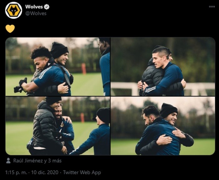 Raúl Jiménez visitó el miércoles el campo de entrenamiento de Sir Jack Hayward, reuniéndose con sus compañeros de equipo por primera vez desde la lesión en la cabeza que sufrió durante la victoria de noviembre frente al Arsenal.Acompañado por el médico del club, Raúl Jiménez fue recibido con abrazos y sonrisas por el equipo, que rompió momentáneamente con el entrenamiento para dar la bienvenida al delantero mexicano en el Compton Park.Jiménez presenció parte de la sesión junto al entrenador Nuno Espirito Santo, antes de regresar a su casa, donde está convaleciente desde que fue dado de alta del hospital la semana pasada.Una pancarta gigante en apoyo de Jiménez, financiada por aficionados de todo el mundo y que cubre tres bloques de la tribuna superior de Steve Bull, se estrenará en el partido de este sábado contra el Aston Villa, que Raúl va a ver desde casa.En el minuto seis del partido, en un saque de esquina a favor del Arsenal, David Luiz buscó rematar el balón en el primer palo, pero lo que se encontró fue la cabeza del delantero mexicano, provocándole una fractura de cráneo.David Luiz pudo reincorporarse y seguir el juego con un aparatoso vendaje en la cabeza, antes de ser sustituido al descanso, pero Jiménez fue sacado del campo en camilla después de haber sido atendido por los médicos durante más de 10 minutos.OF