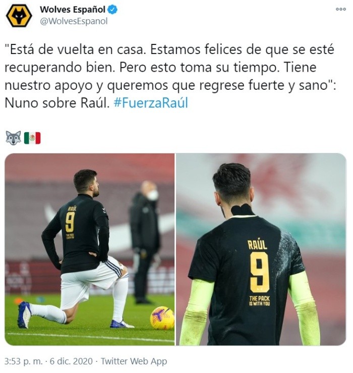 El futbolista mexicano Raúl Jiménez, del Wolverhampton, salió del hospital en el que estaba ingresado en Londres, luego de sufrir una fractura de cráneo el domingo pasado.Jiménez fue trasladado a su domicilio, donde descansa junto a su pareja, Daniela, y su hija, Arya, según confirmó el entrenador del Wolverhampton Wanderers, Nuno Espirito Santo, a la cadena Sky Sports."Raúl ha vuelto a casa. Estamos encantados de que lo haya hecho. Está mejorando y poco a poco volviendo a la normalidad", dijo el técnico portugués.Jiménez, de 29 años, llevaba en el hospital desde el 29 de noviembre, luego de sufrir un choque cabeza con cabeza con David Luiz, del Arsenal.Fue operado y permaneció en el hospital en observación, hasta que ha podido ser trasladado a su domicilio, donde comenzará su proceso de rehabilitación.En forma de homenaje, los jugadores del Wolves realizaron este domingo el calentamiento con camisetas en su apoyo.IM